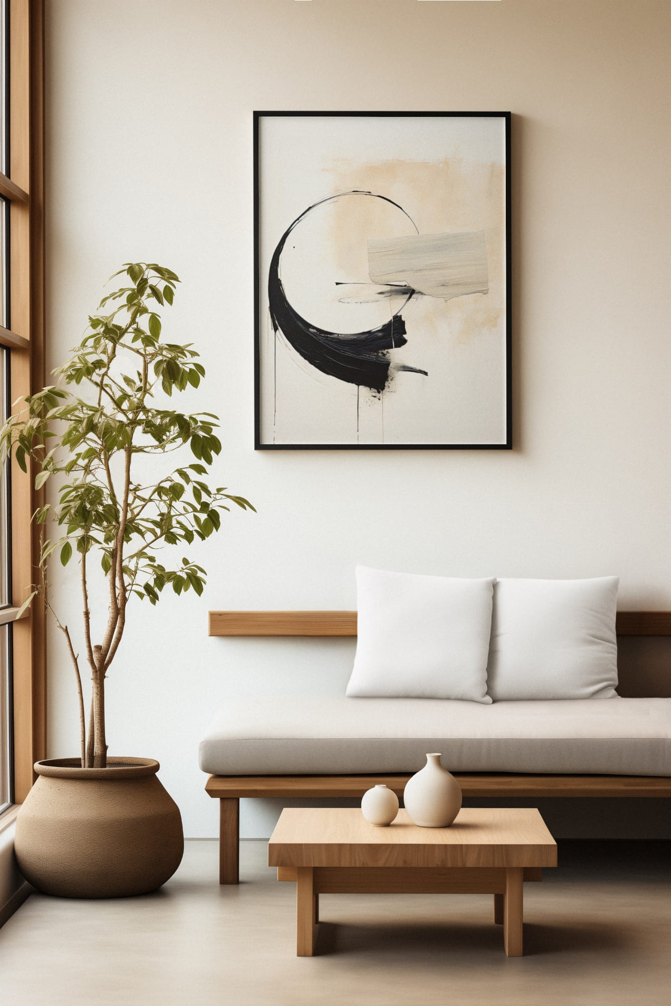 Plakat ukazuje abstrakcyjną kompozycję z dominującym czarnym łukiem, obok beżowego, teksturowanego prostokąta. Ruch pędzla tworzy wrażenie płynności i dynamiki, a minimalistyczne barwy dodają pracy subtelności. Kontrast pomiędzy czernią a jasnymi odcieniami przyciąga uwagę.