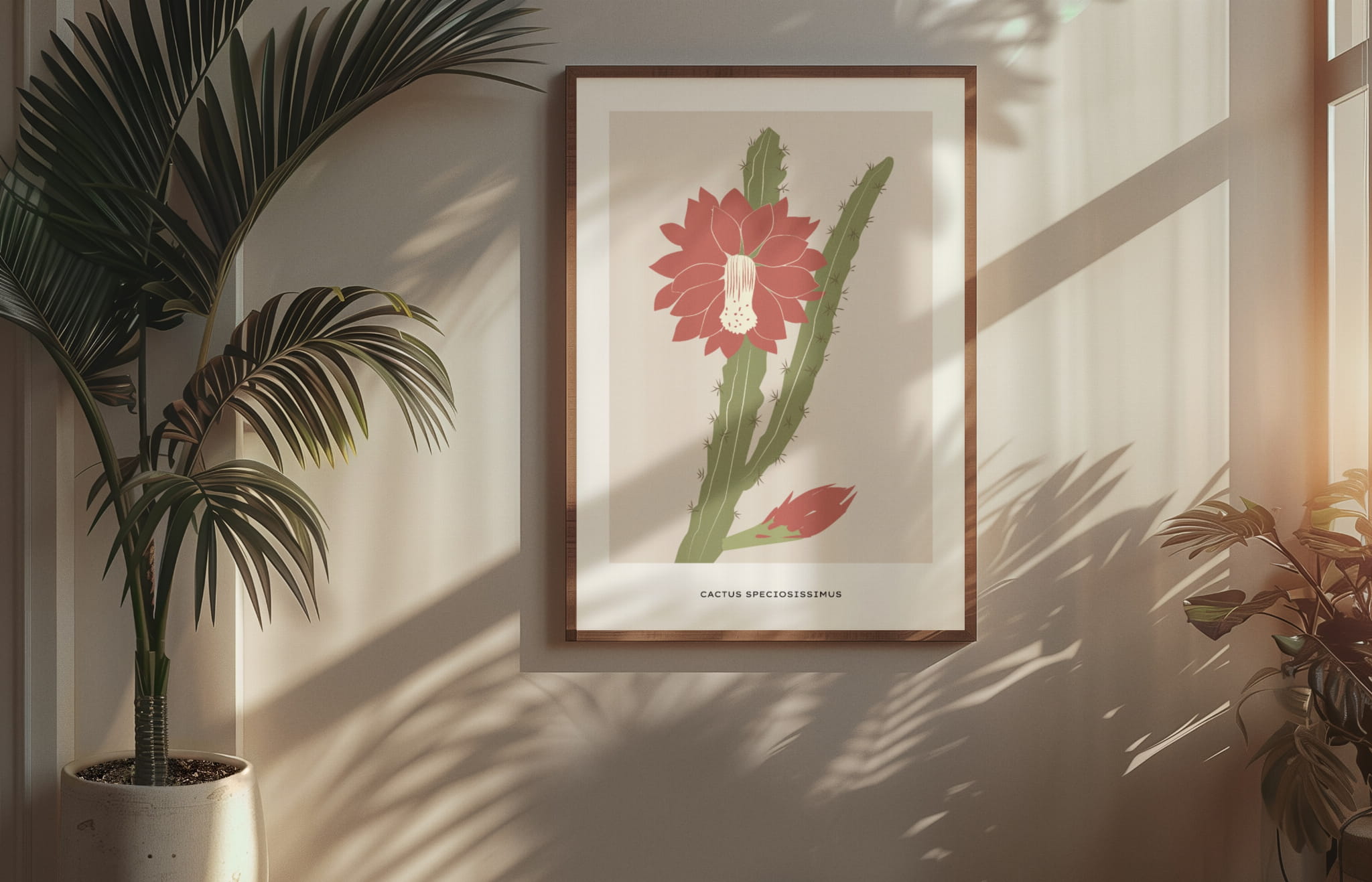 Plakat przedstawia zielony kaktus z długimi kolcami, na którym rozkwita duży, czerwono-pomarańczowy kwiat o wielkich płatkach i jasnym, kremowym wnętrzu.