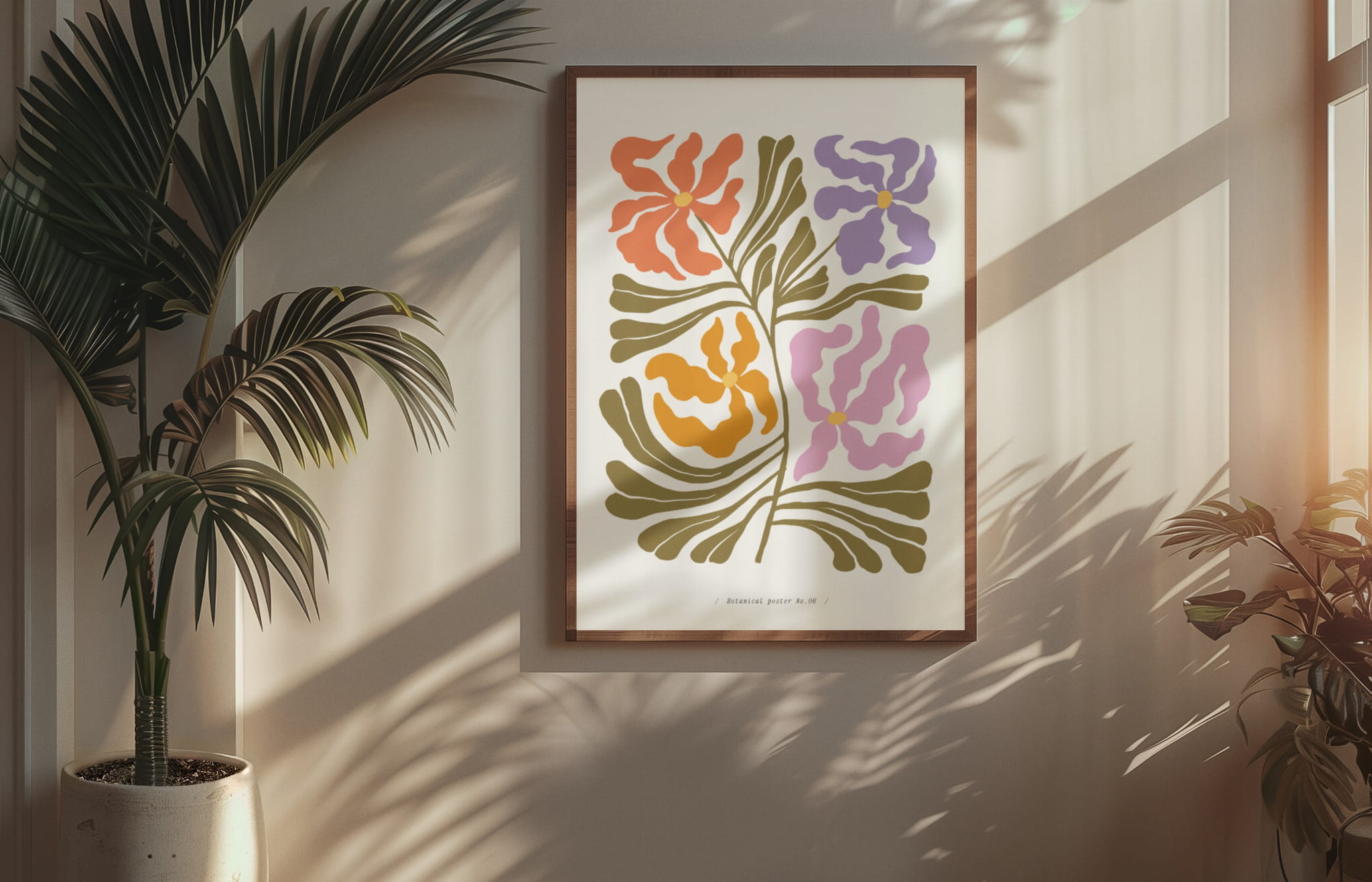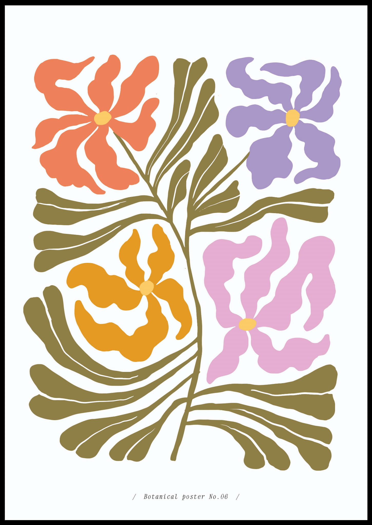 Plakat przedstawia abstrakcyjny motyw botaniczny, składający się z czterech stylizowanych kwiatów w żywych kolorach.