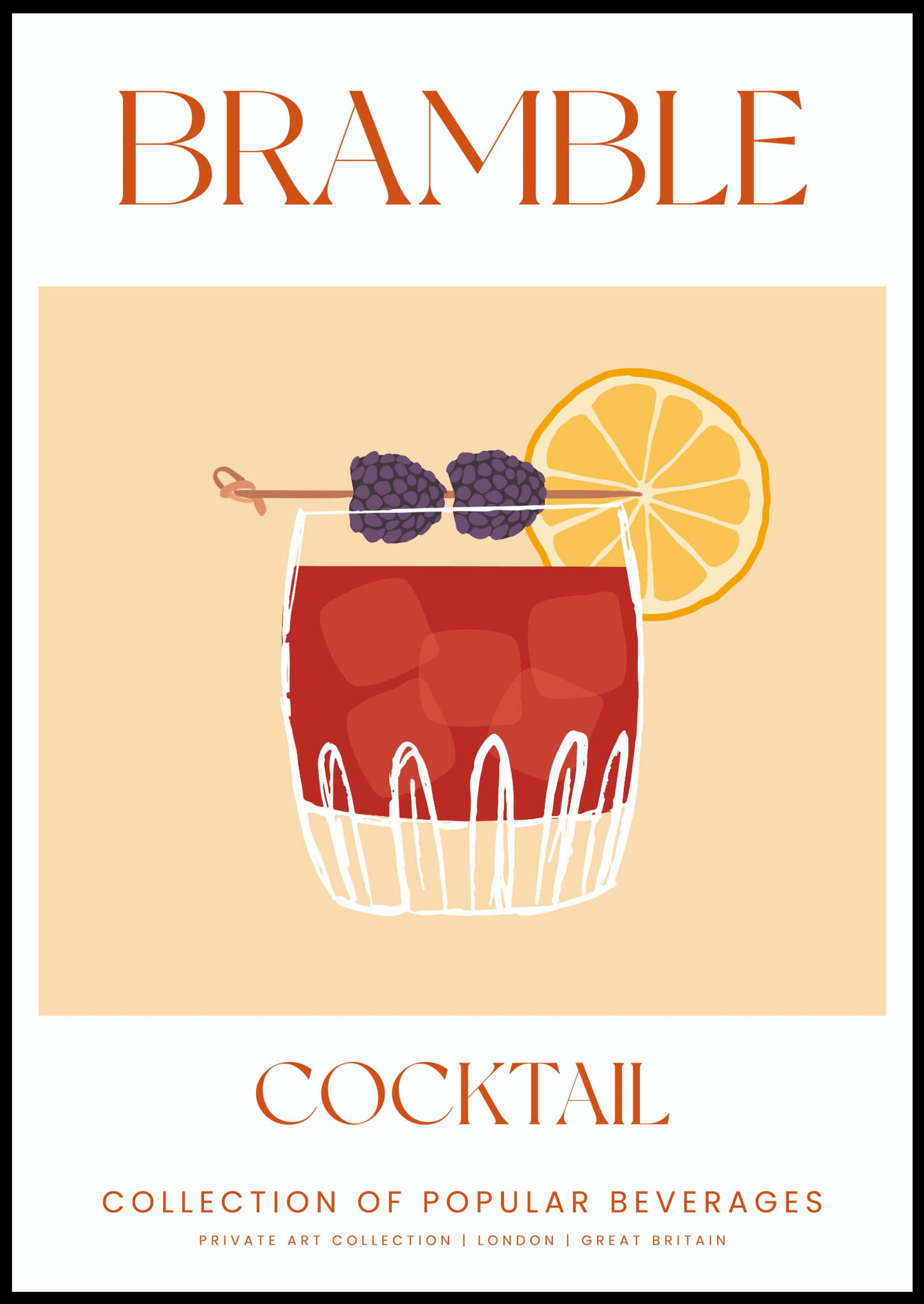 Plakat przedstawia elegancki koktajl Bramble, znany z wyrazistego smaku jeżyn połączonych z cytrusowym akcentem.