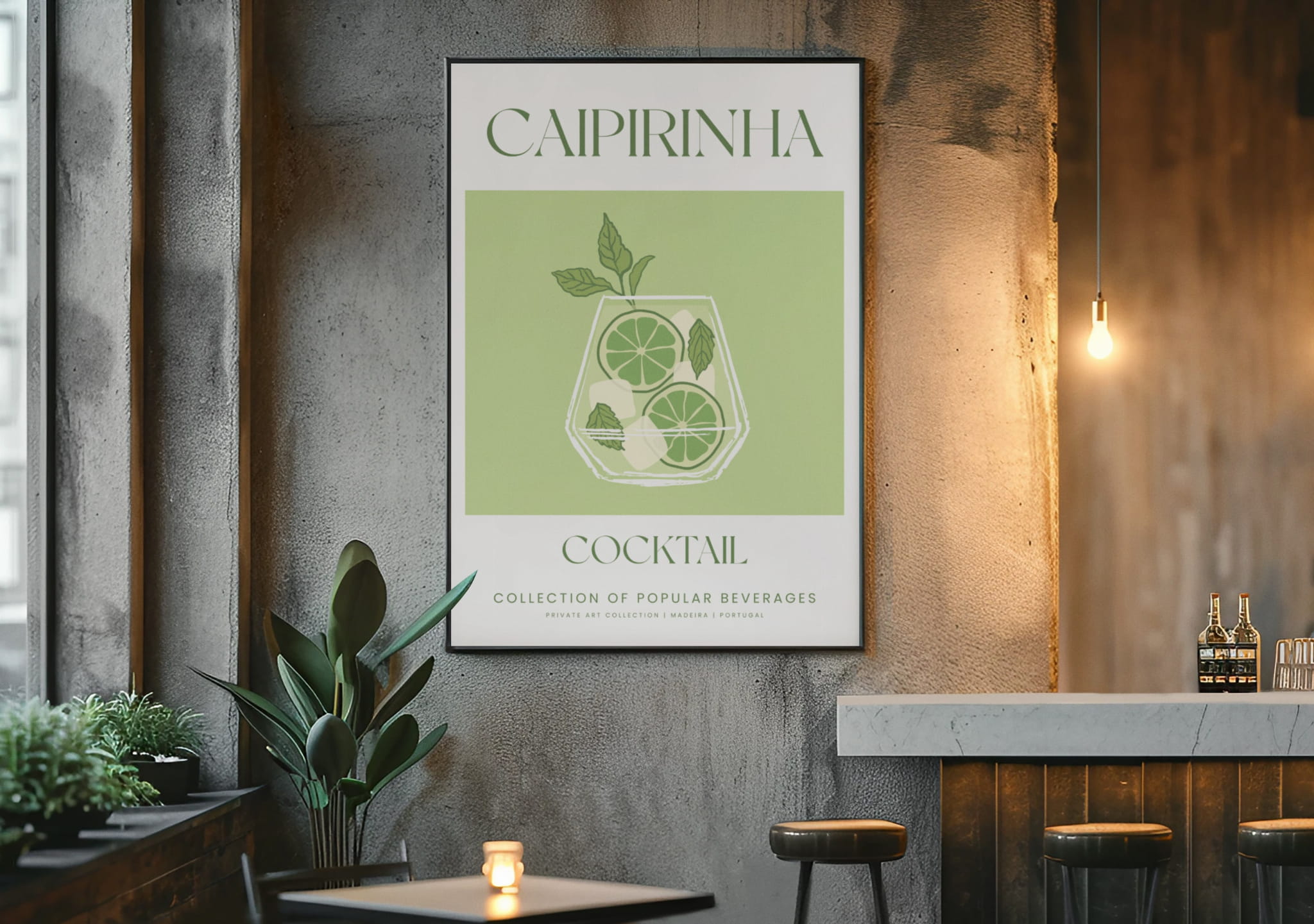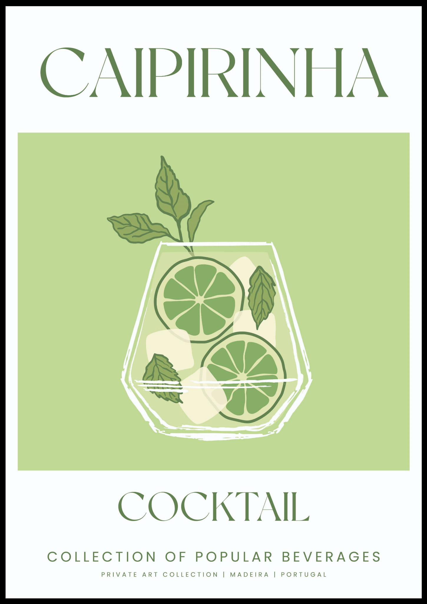 Plakat przedstawia koktajl Caipirinha w szklance wypełnionej limonką i miętą.