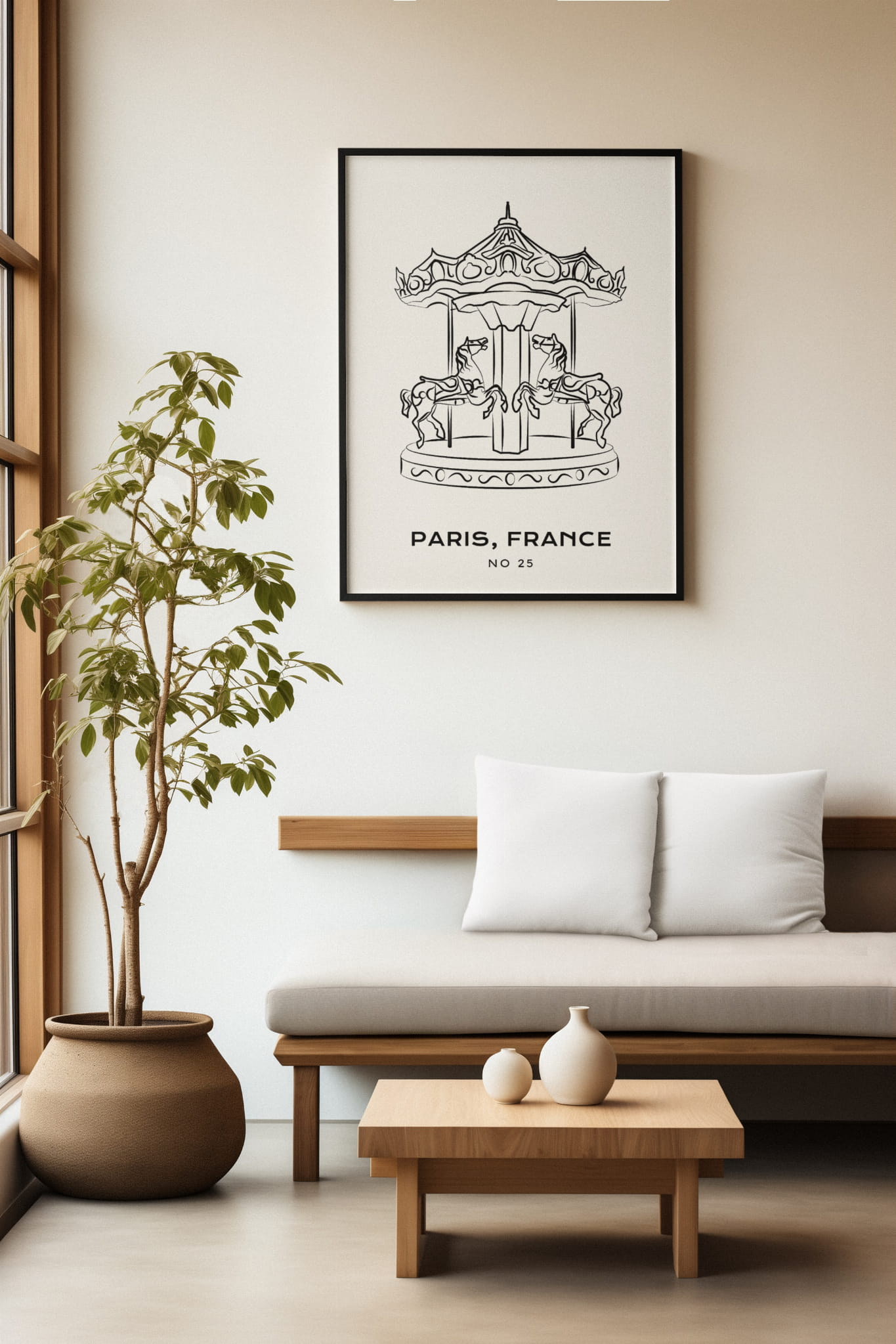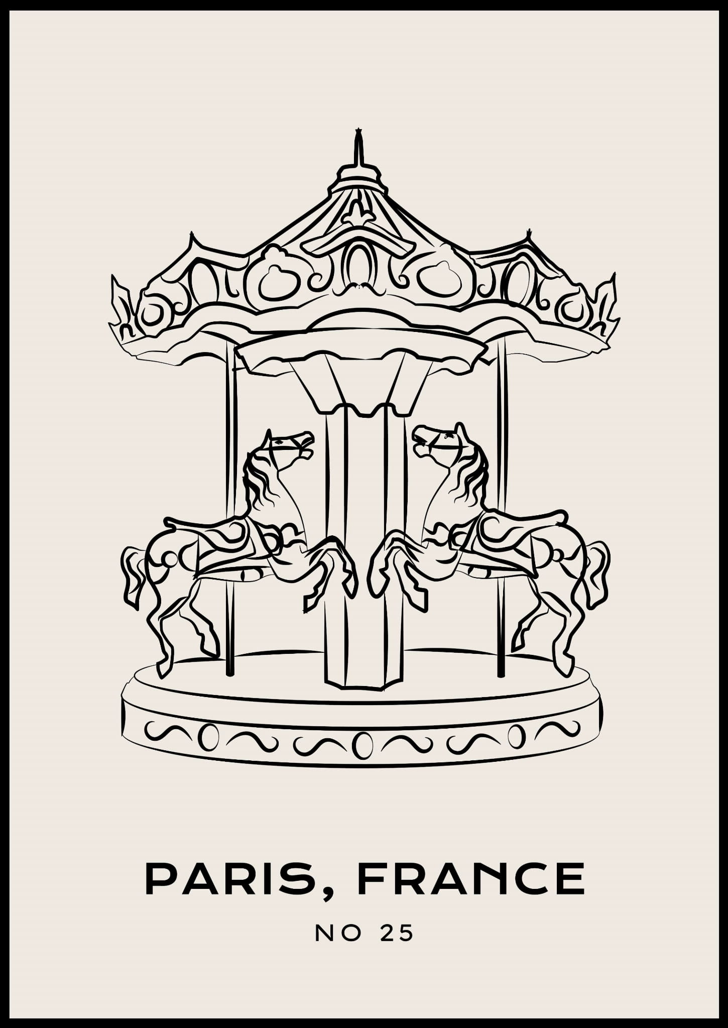 Ilustracja przedstawia czarny kontur klasycznej karuzeli z końmi na jasnym tle.