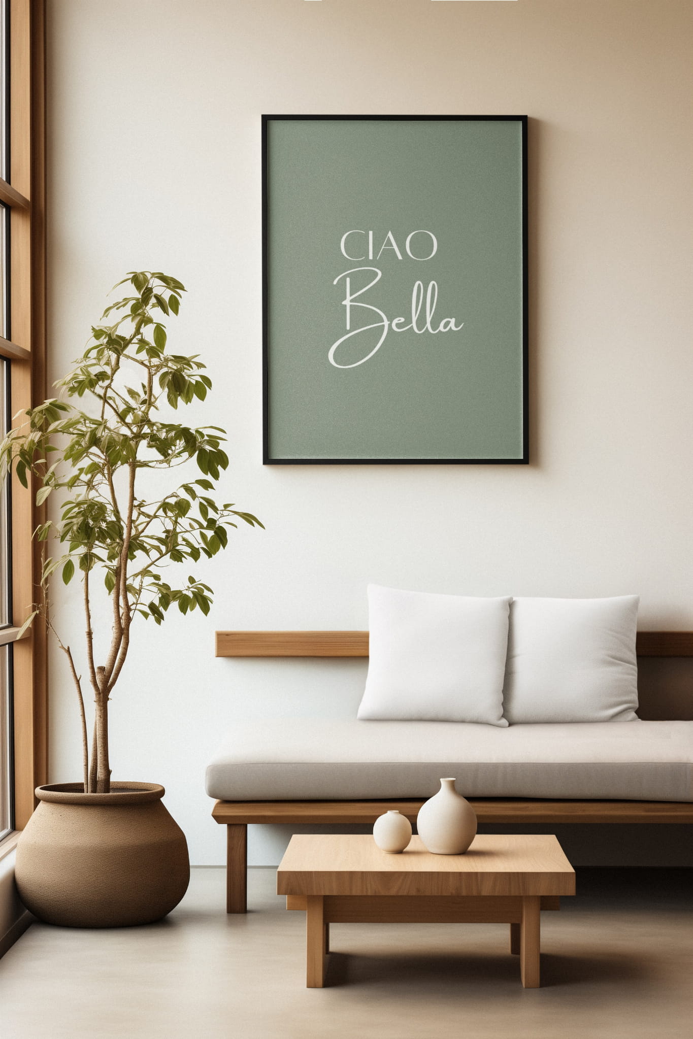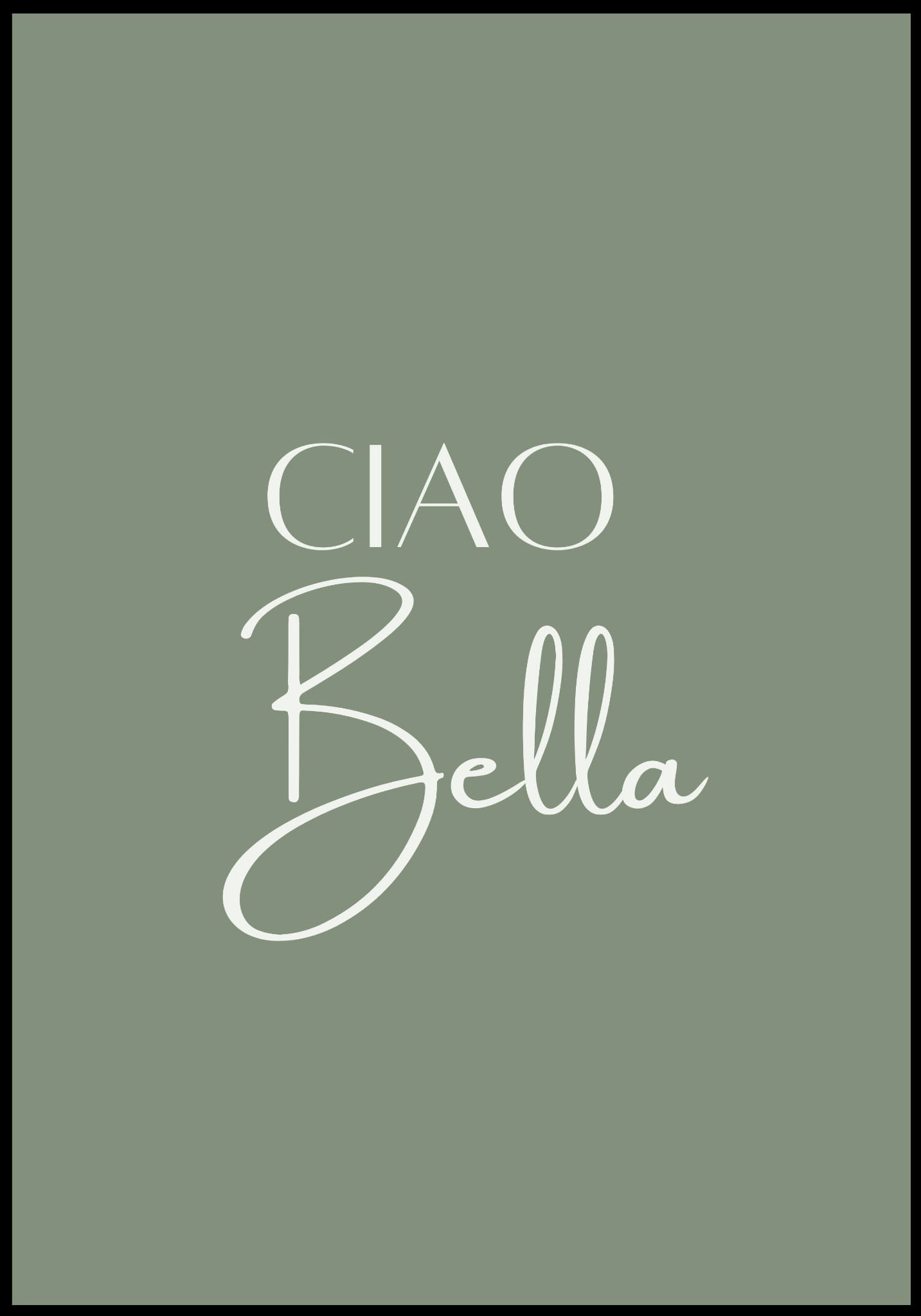 Plakat przedstawia napis Ciao Bella na zielonym tle. Słowa są napisane delikatnym i eleganckim fontem. Plakat emanuje subtelnością i elegancją. Może być użyty jako dekoracja. Dodaje uroku do przestrzeni.