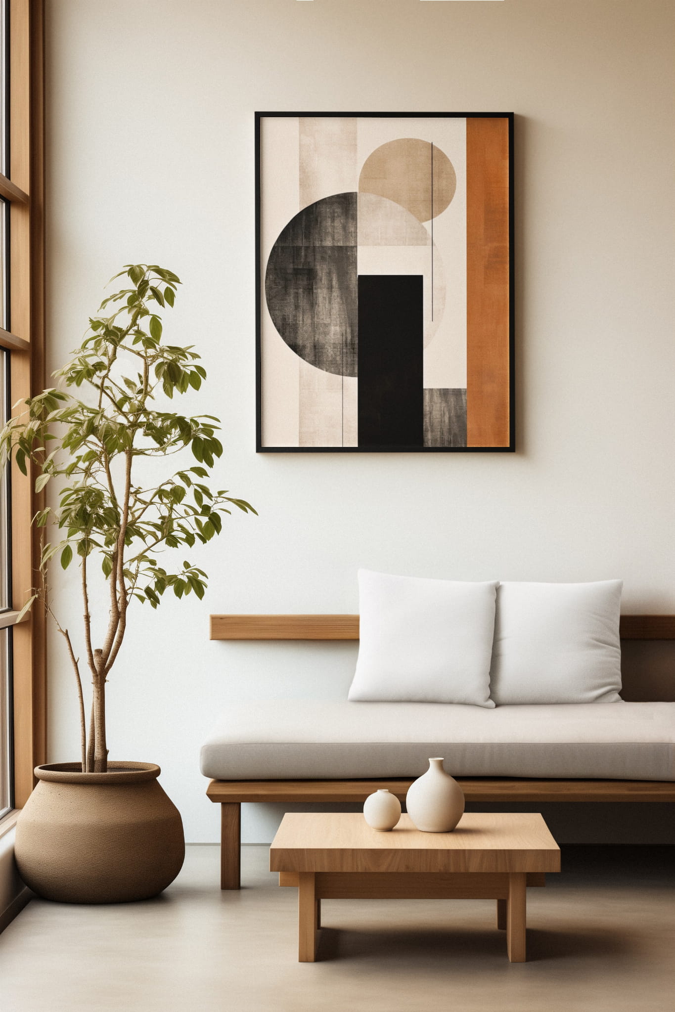 Plakat przedstawia abstrakcyjną kompozycję geometrycznych form, w której dominują okręgi, prostokąty i pionowe linie. Kolory w odcieniach rdzy, beżu i czerni tworzą ciepły, zbalansowany kontrast.