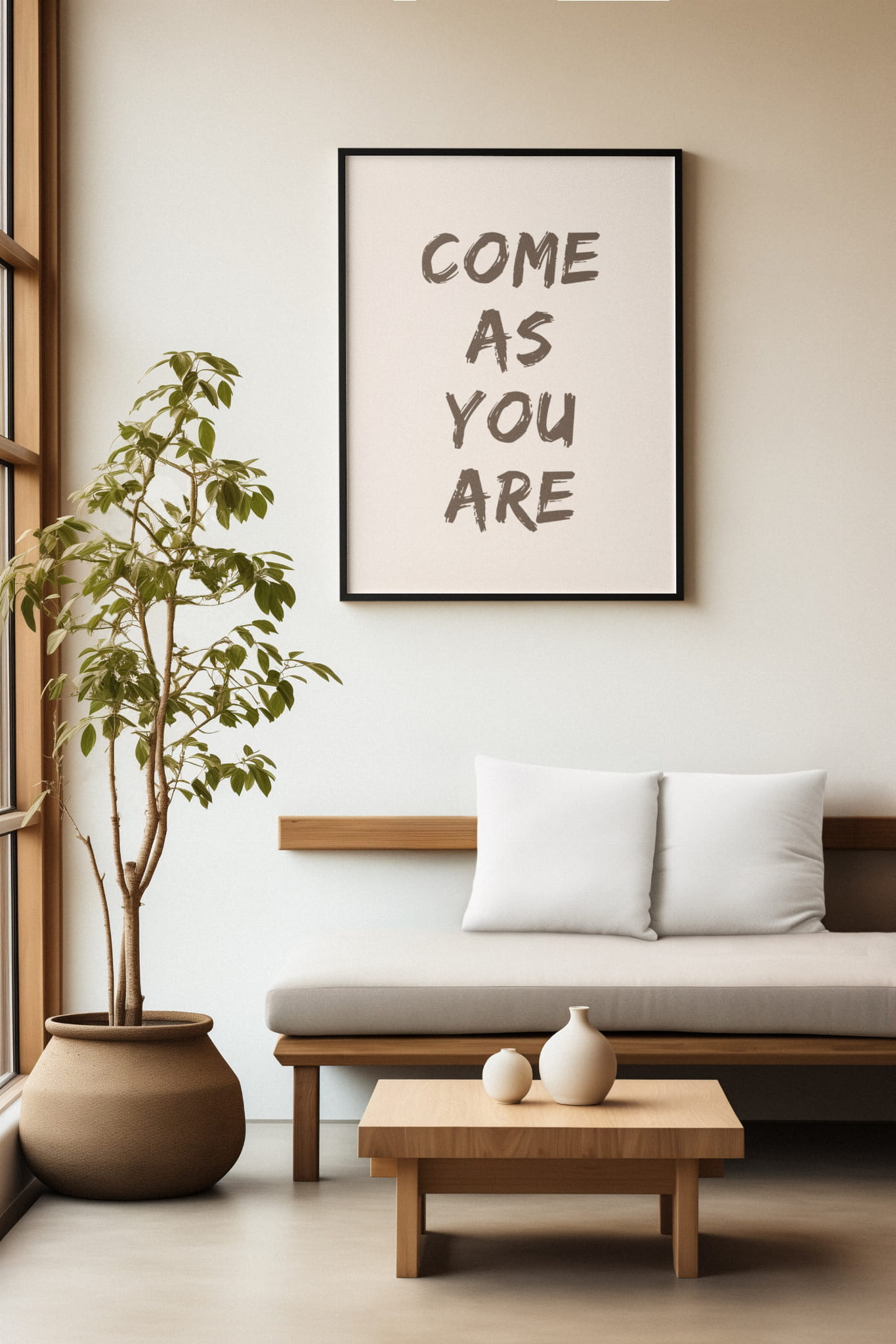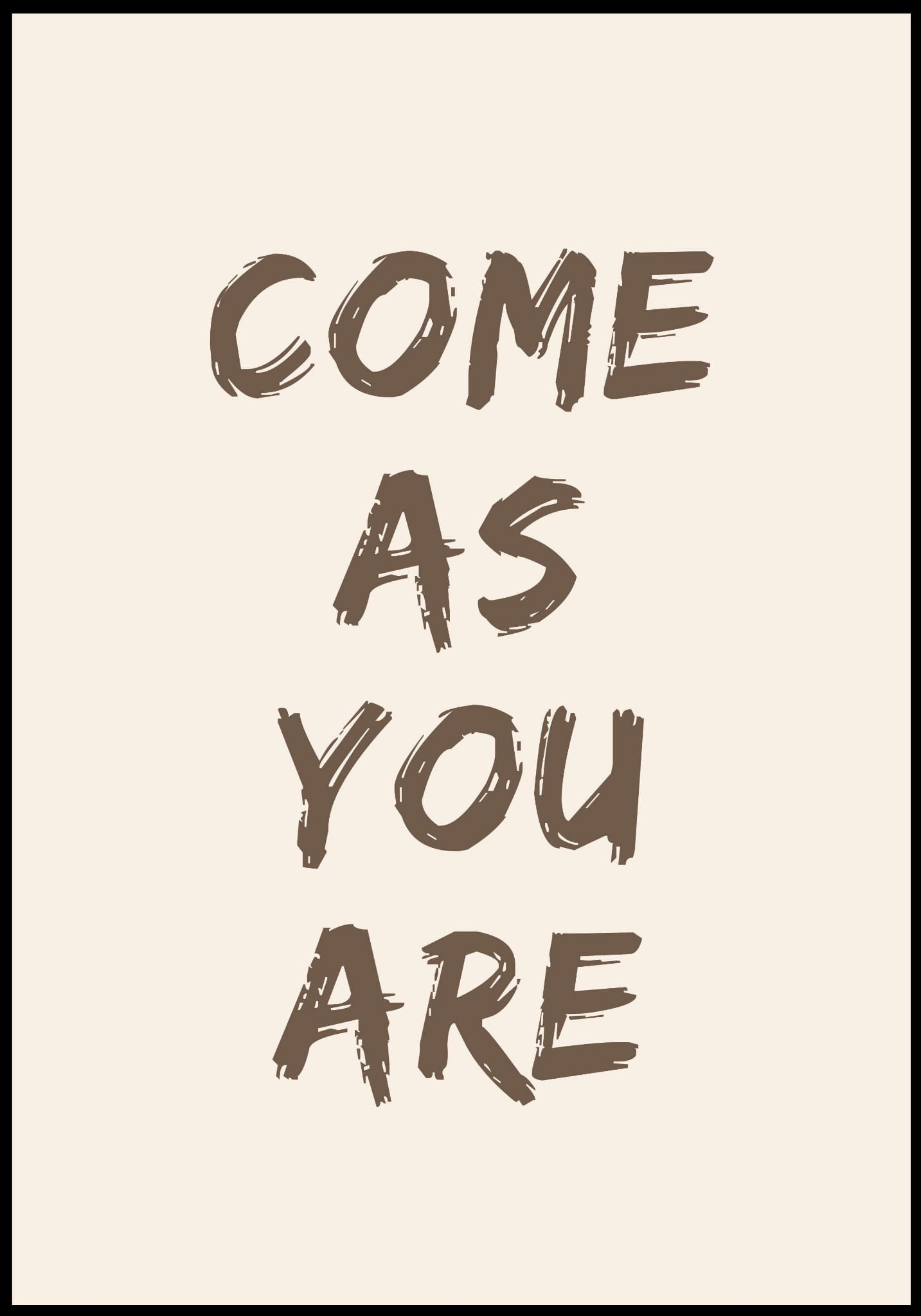 Plakat z napisem "COME AS YOU ARE" umieszczone na jednolitym, jasnym tle.