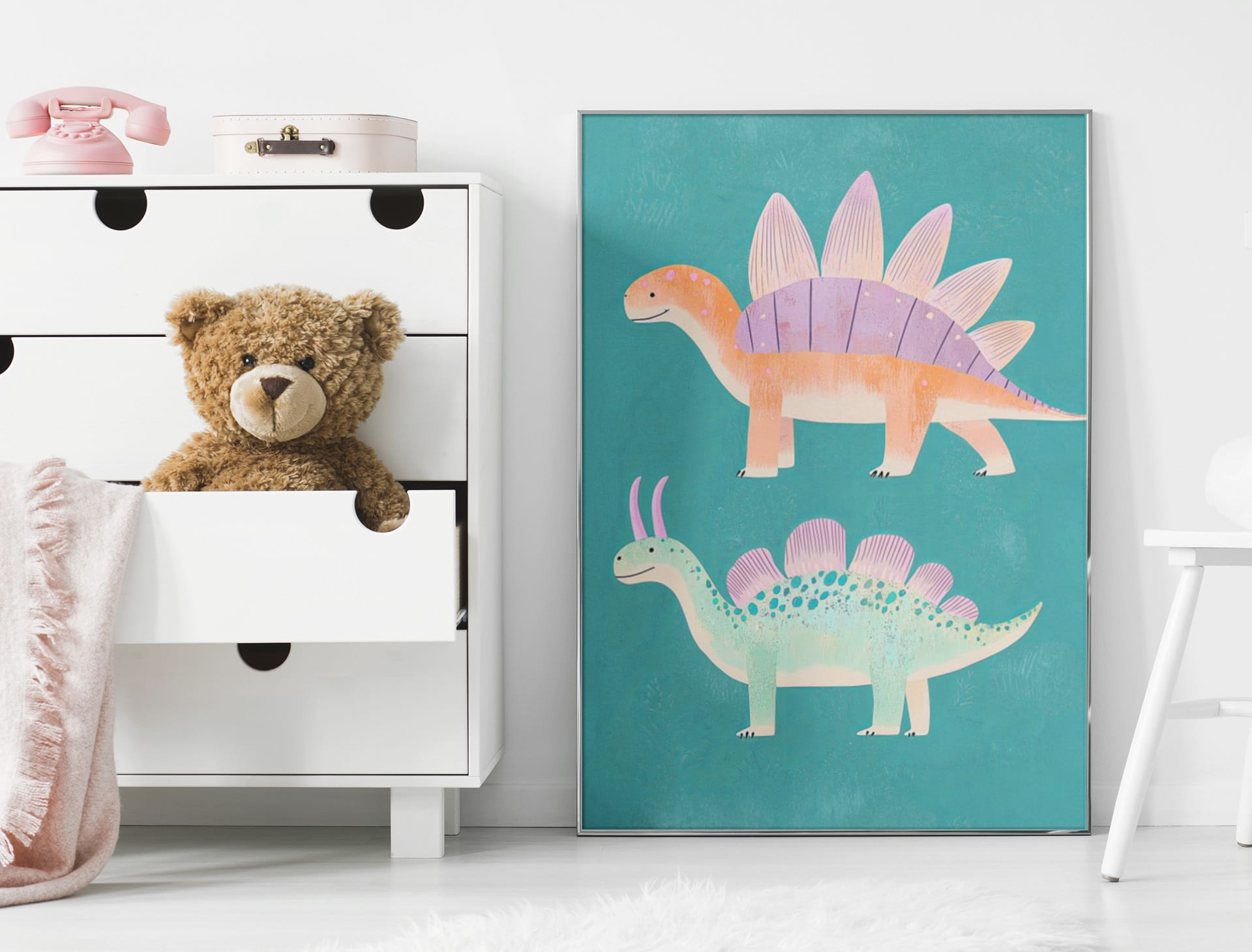 Ilustracja przedstawia dwa urocze dinozaury na turkusowym tle. Oba dinozaury mają pastelowe kolory i sympatyczny wygląd, co tworzy wesoły i przyjazny nastrój.