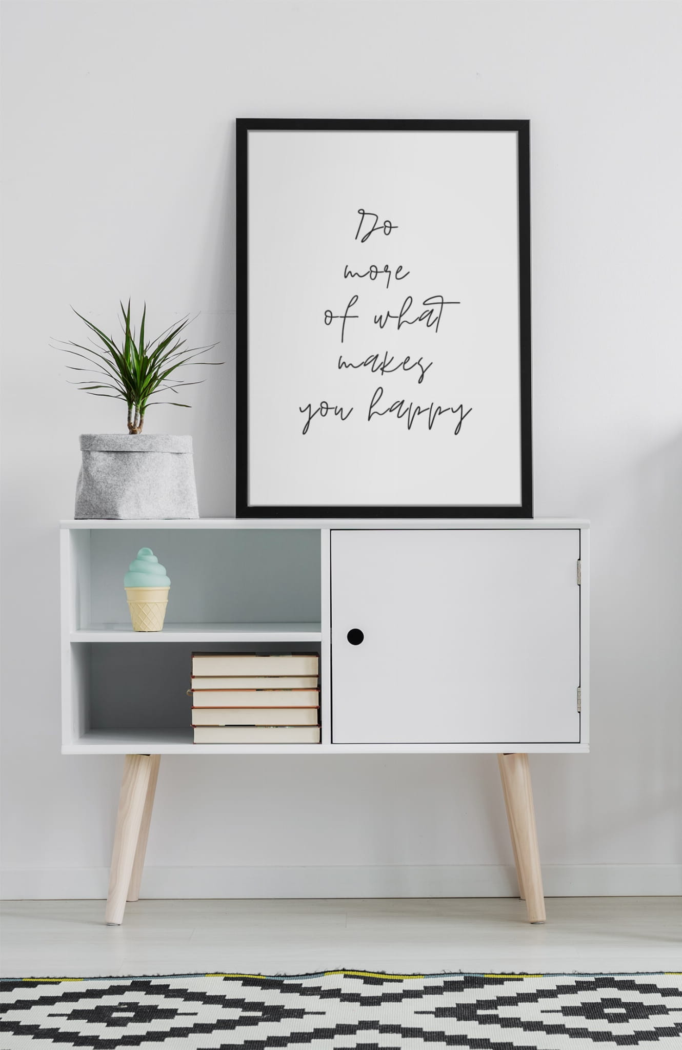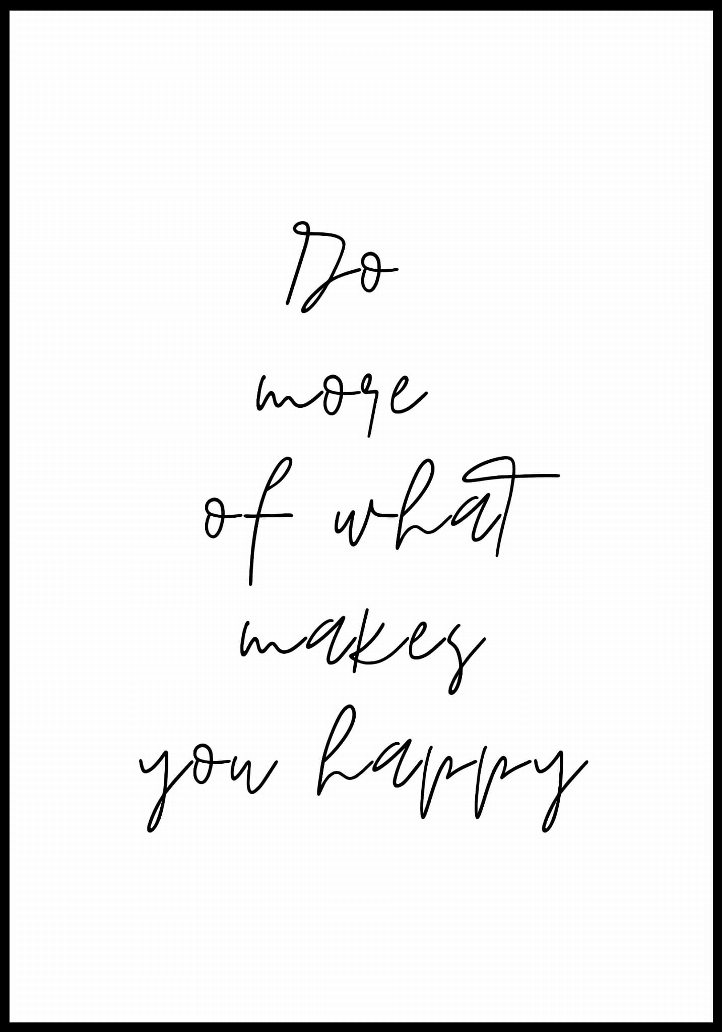 Plakat z napisem "Do more of what makes you happy". Tekst jest napisany elegancką, czarną czcionką na białym tle, co nadaje mu minimalistyczny i nowoczesny wygląd. Prostota i przejrzystość plakatu przyciągają uwagę do przesłania.