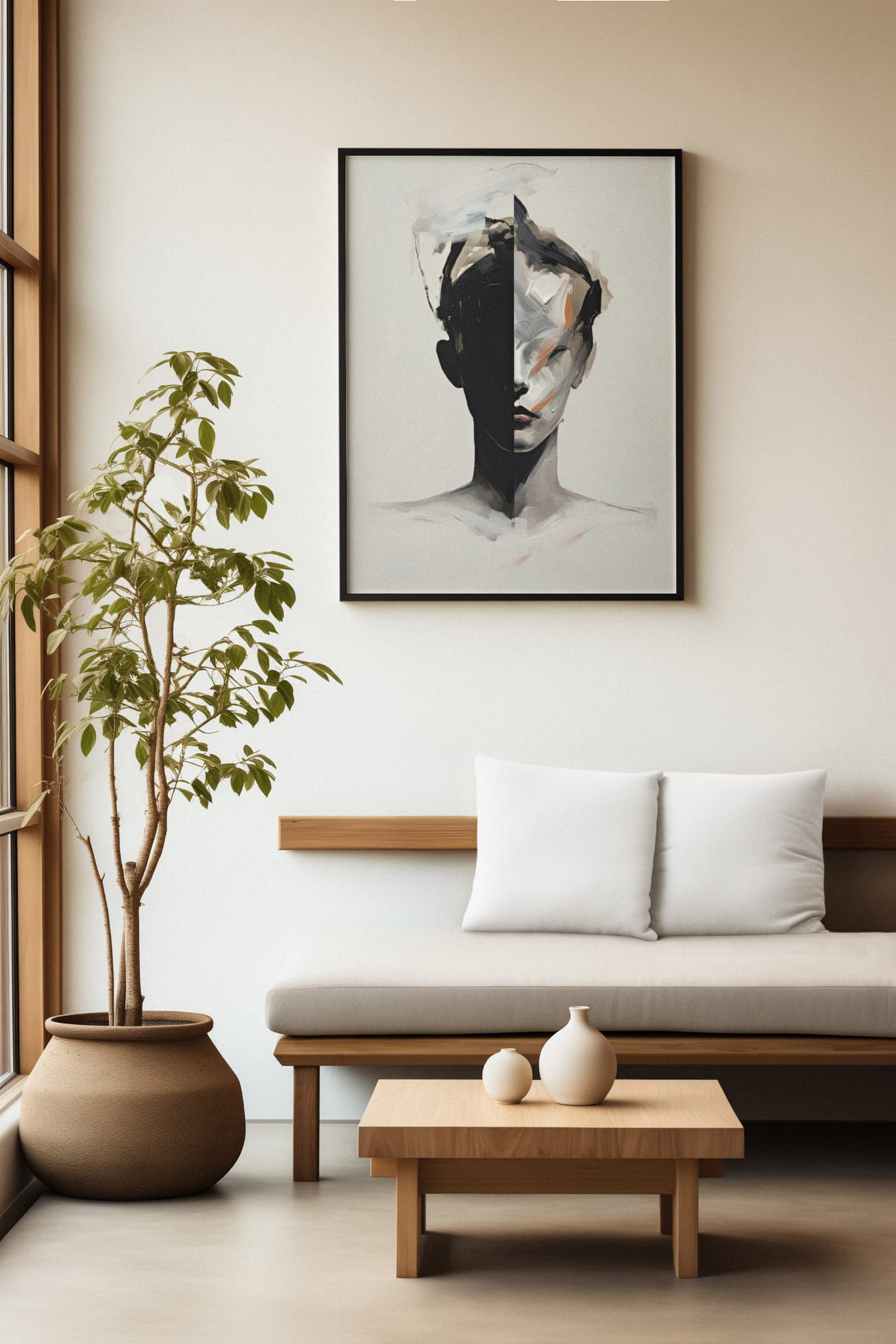 Plakat przedstawia abstrakcyjny portret twarzy, podzielony na dwie wyraźnie różne połowy. Jedna strona jest ciemna i minimalistyczna, druga pełna dynamicznych pociągnięć pędzla w jasnych kolorach. Praca wyraża kontrast i równowagę pomiędzy światłem a cieniem.