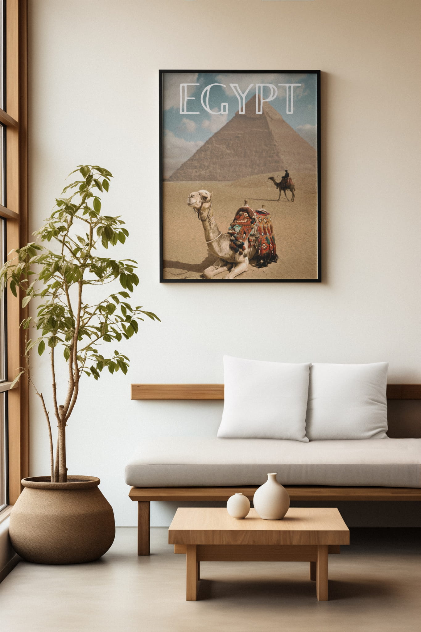 Grafika przedstawia egipską pustynię z wielką piramidą w tle. Na pierwszym planie znajduje się wielbłąd z kolorowym, ozdobnym siodłem, siedzący na piasku.
