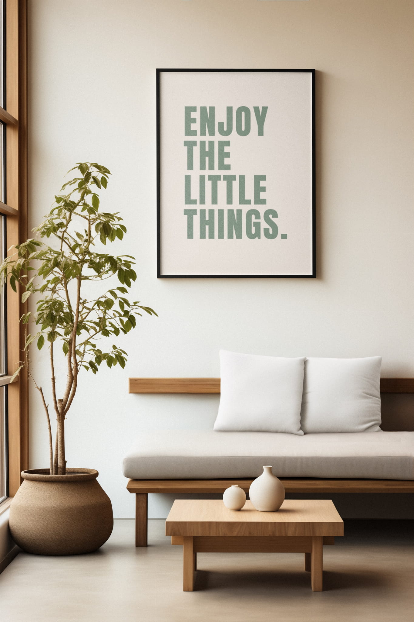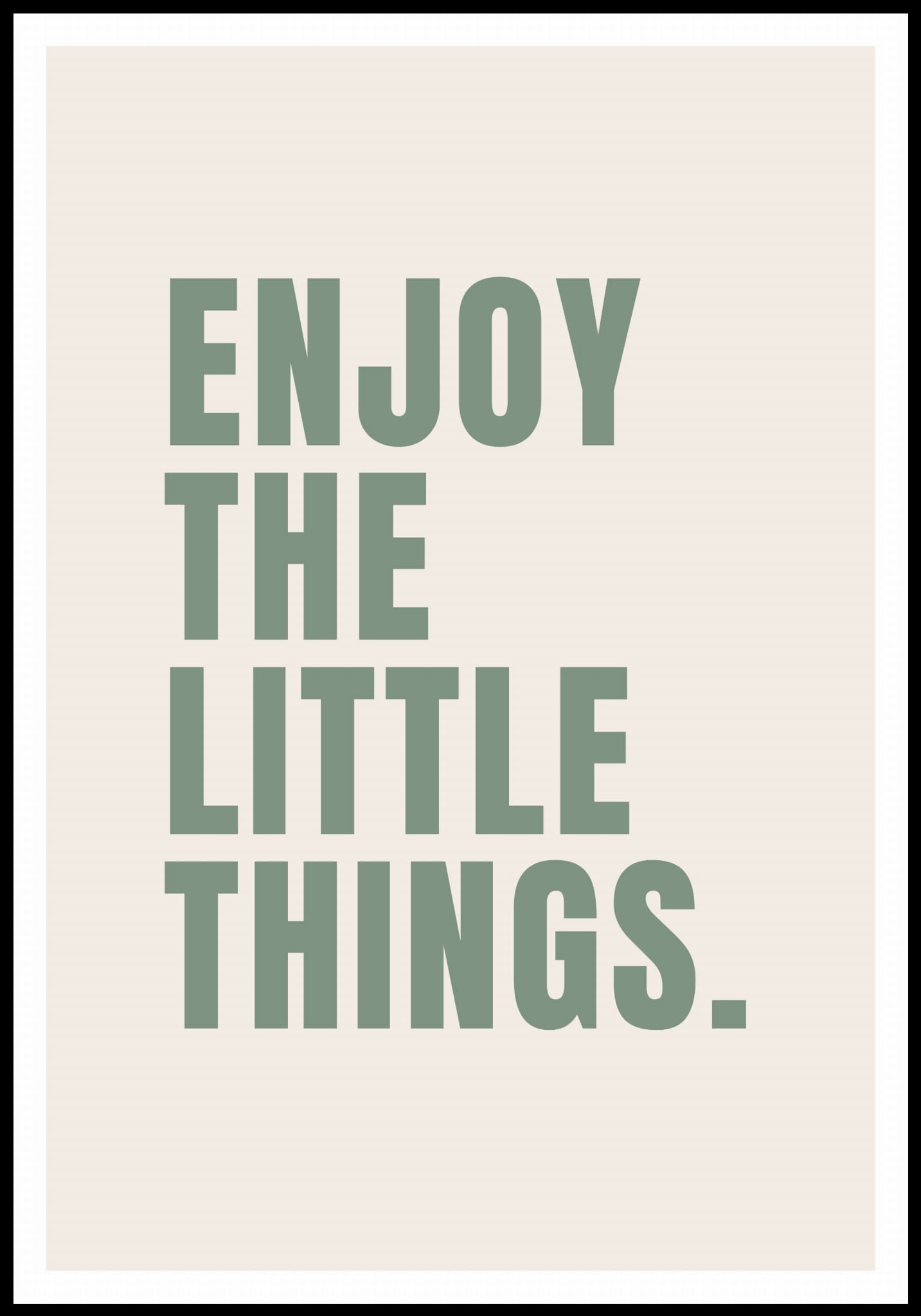 Plakat typograficzny z napisem "Enjoy The Litlle Things". Tekst utrzymany jest w eleganckiej, stonowanej kolorystyce, co nadaje mu subtelnego uroku. W pomieszczeniu plakat ten wprowadza spokojną i inspirującą atmosferę. Świetnie sprawdzi się zarówno w nowoczesnych, jak i klasycznych wnętrzach, dodając im odrobinę refleksji i pozytywnej energii.