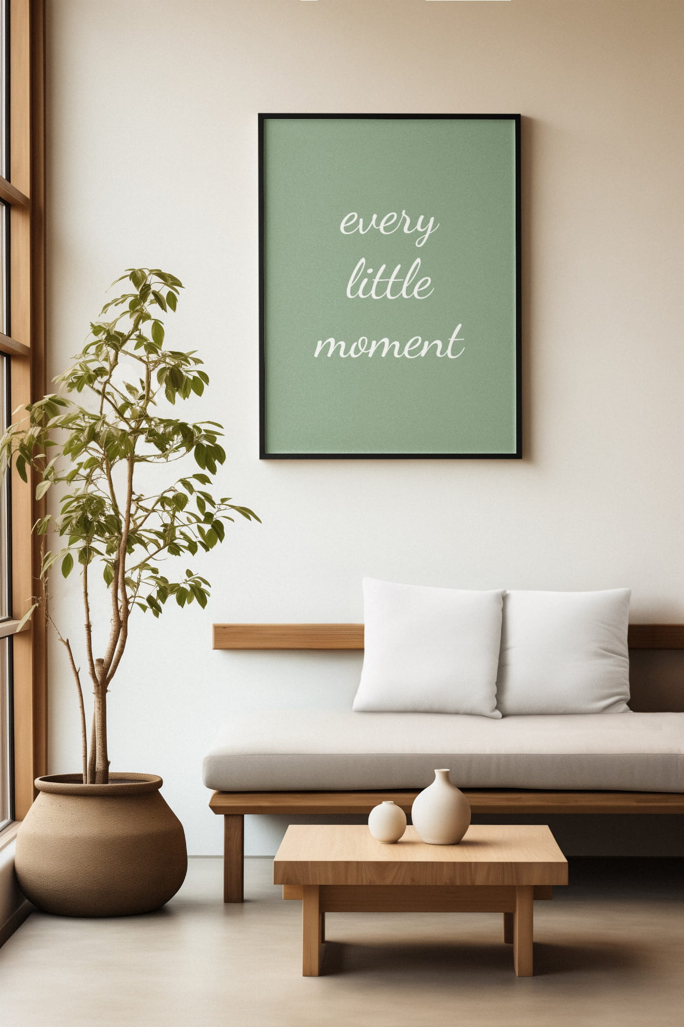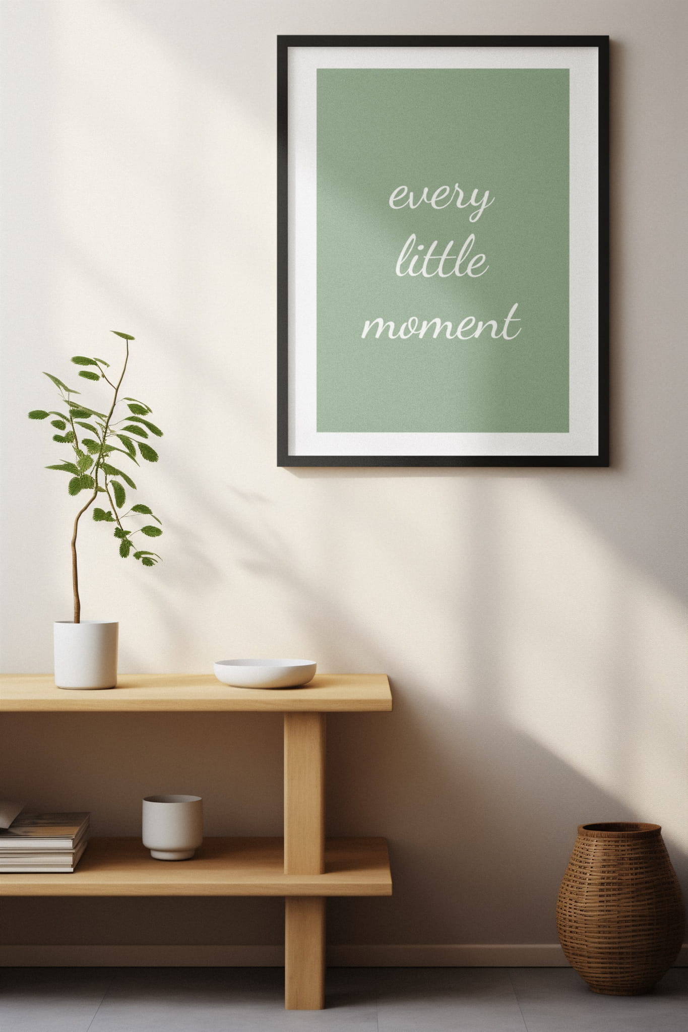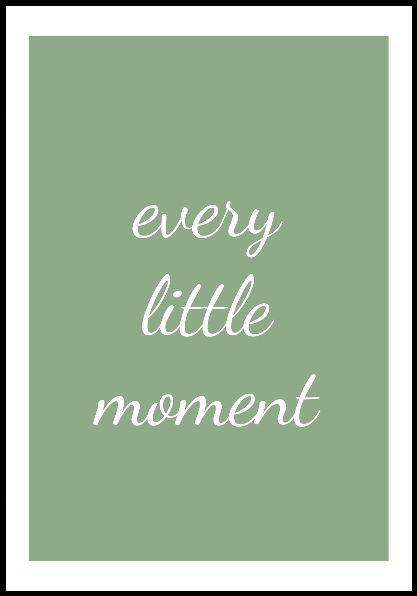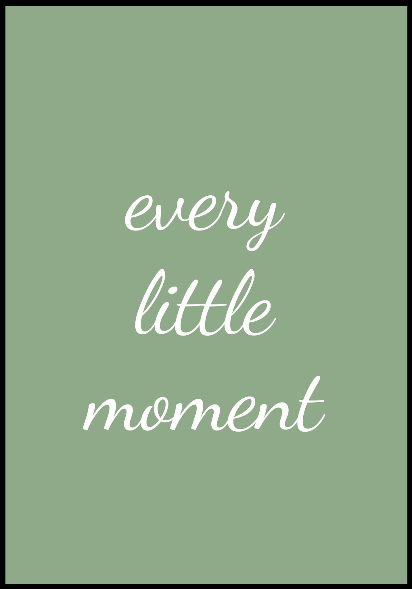 Plakat ma łagodne, zielone tło, na którym umieszczony jest elegancki, biały napis "every little moment" w delikatnym, ręcznie pisanym stylu. Subtelna kaligrafia tworzy wrażenie lekkości i harmonii. Minimalistyczny design podkreśla urok prostoty i piękno codziennych chwil.