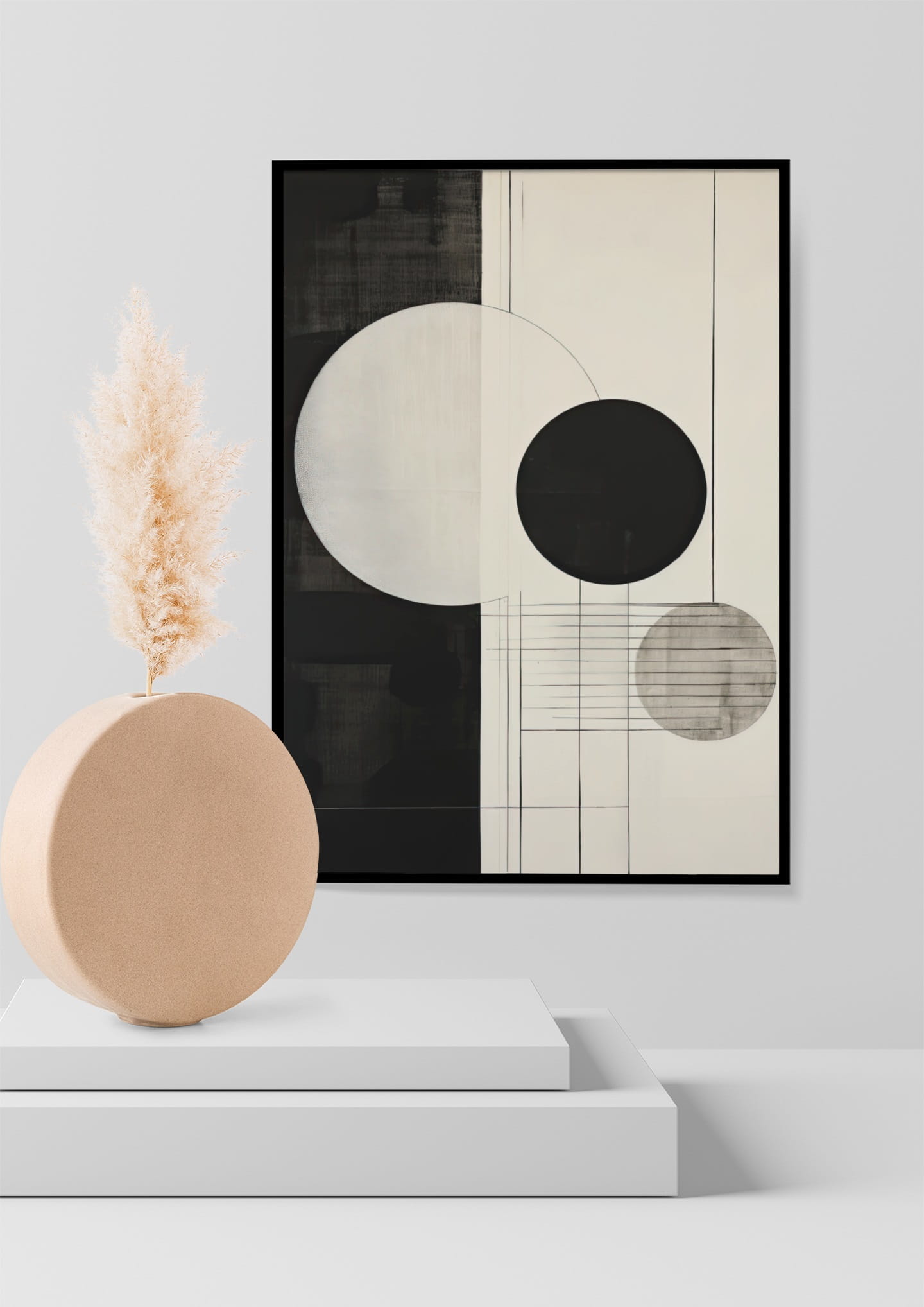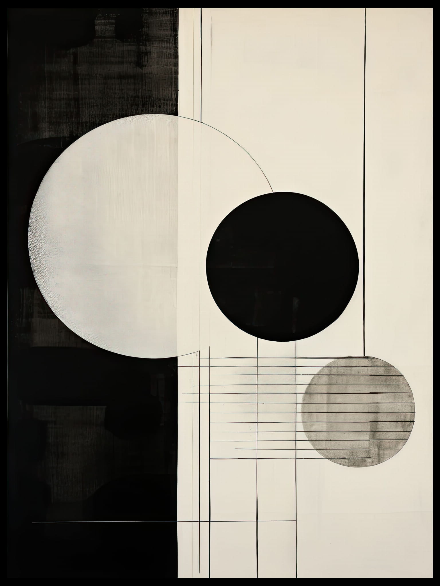 Elegancka kompozycja geometrycznych kształtów w odcieniach czerni i bieli. Duże okręgi i cienkie linie tworzą harmonijną całość. Minimalistyczny design idealnie pasuje do nowoczesnych wnętrz. Dodaj ten plakat do swojej kolekcji, aby wprowadzić do domu odrobinę artystycznej elegancji. Ciesz się wyjątkowym stylem i prostotą każdego dnia.