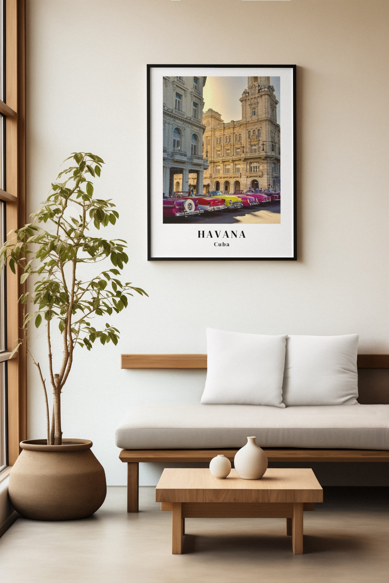 Plakat przedstawia scenę z Hawany, z rzędem kolorowych, klasycznych samochodów na tle eleganckiej kolonialnej architektury. Ciepłe światło podkreśla urok i historyczny charakter miasta.