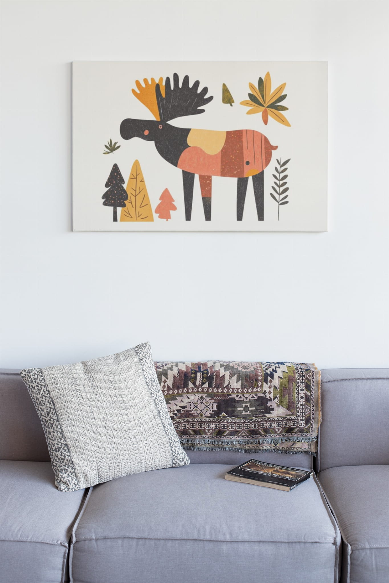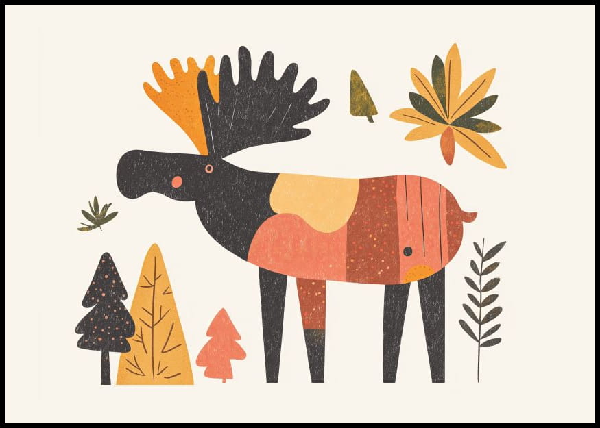 Ilustracja przedstawia stylizowanego łosia w jesiennych kolorach, otoczonego liśćmi i drzewami. Dominują ciepłe barwy, takie jak pomarańcz, żółć i brąz, które wprowadzają przytulną atmosferę.