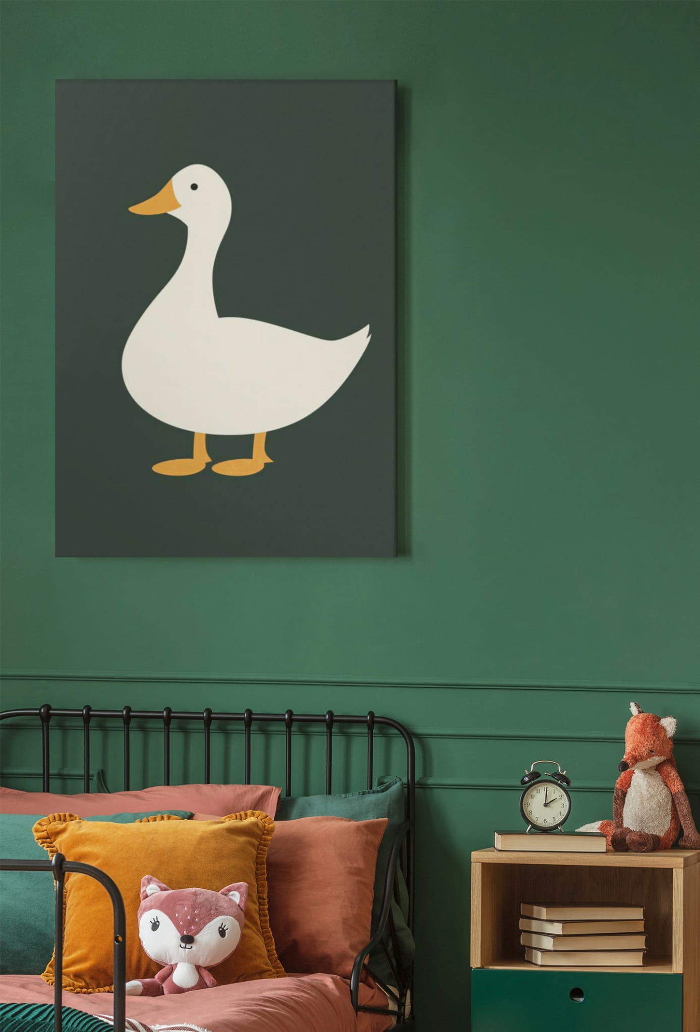 Ilustracja przedstawia prostą kaczkę na ciemnozielonym tle.