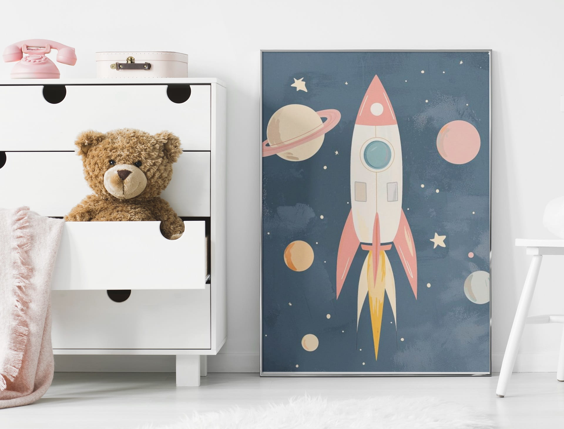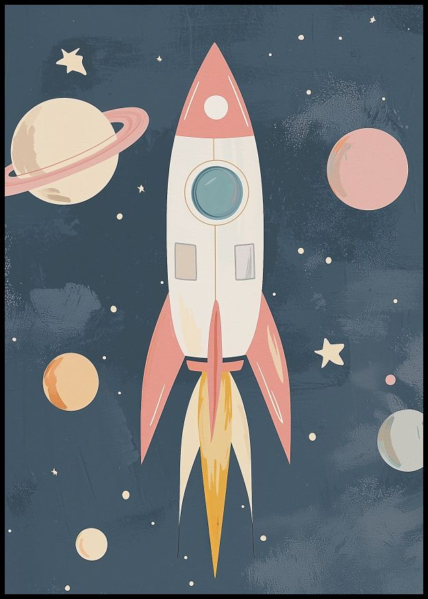 Ilustracja przedstawia rakietę kosmiczną otoczoną planetami na tle ciemnego, nocnego nieba. Dominują kolory pastelowe, które kontrastują z głębokim odcieniem tła, tworząc przyjemny i uspokajający efekt.
