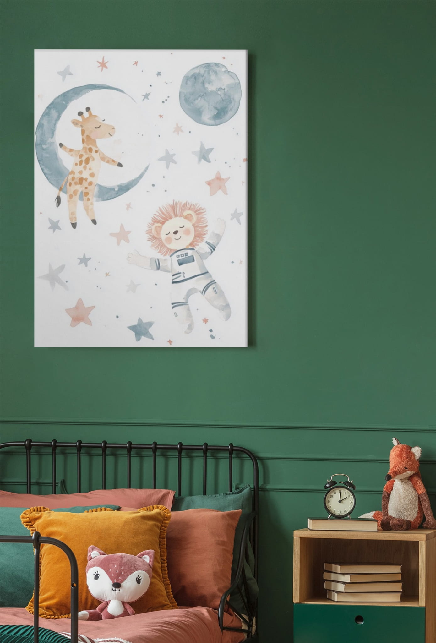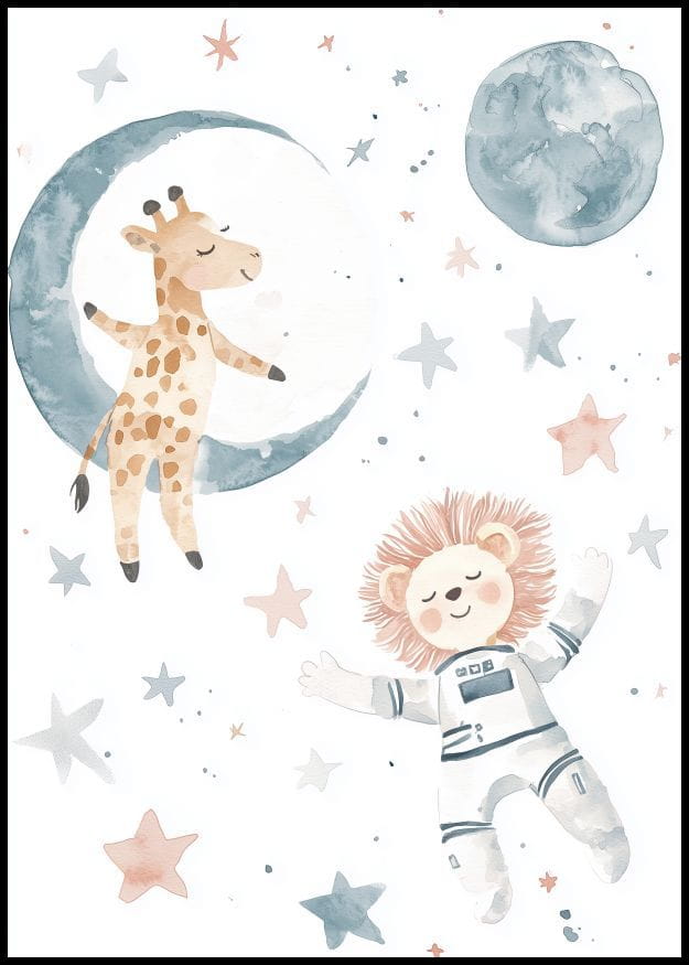 Ilustracja przedstawia żyrafę i lwa w strojach astronautów, dryfujących w kosmosie wśród gwiazd i planet. Plakat utrzymany jest w delikatnych pastelowych kolorach, co nadaje mu marzycielski i uroczy charakter. Idealny do pokoju dziecięcego, by pobudzać wyobraźnię i inspirować do przygód.