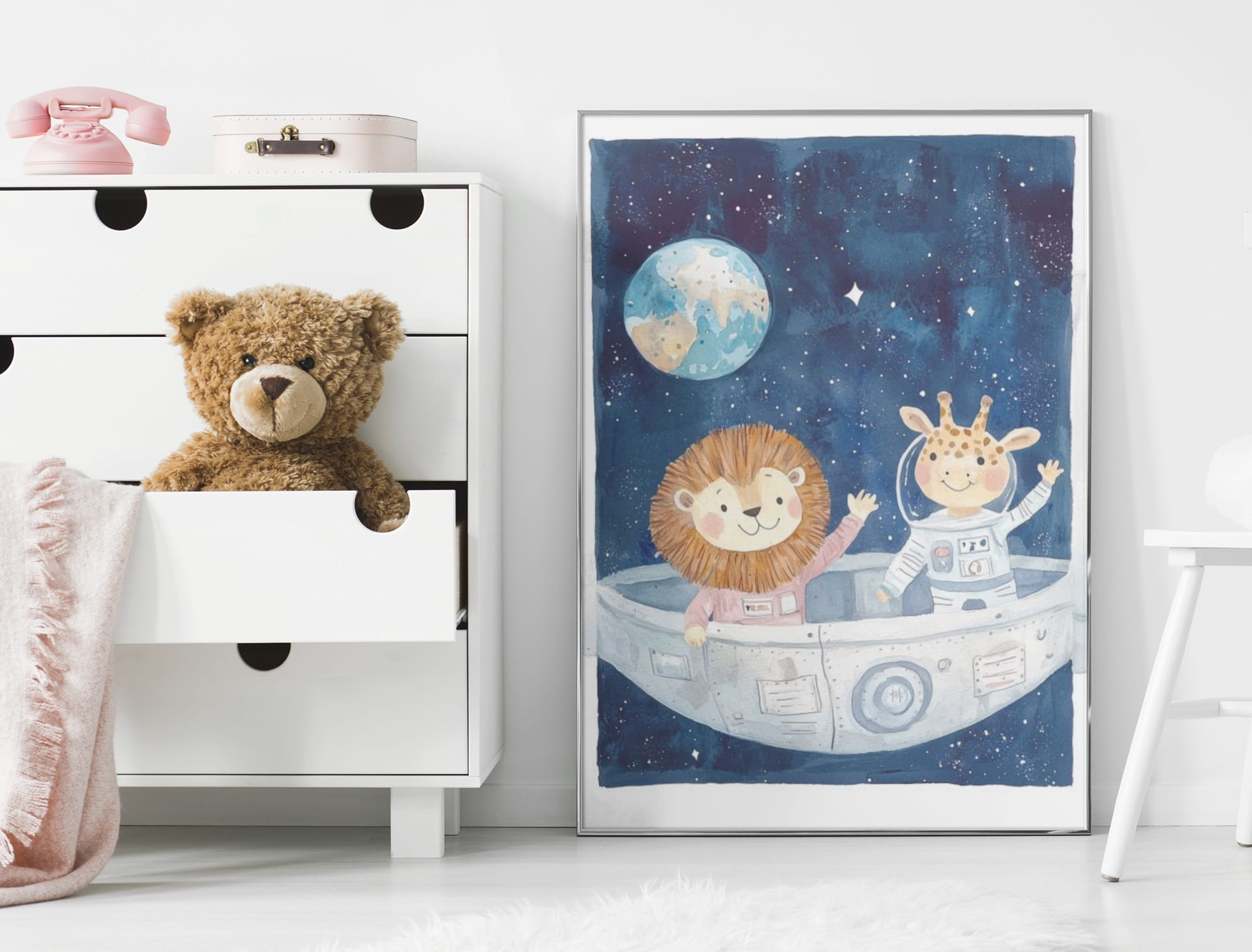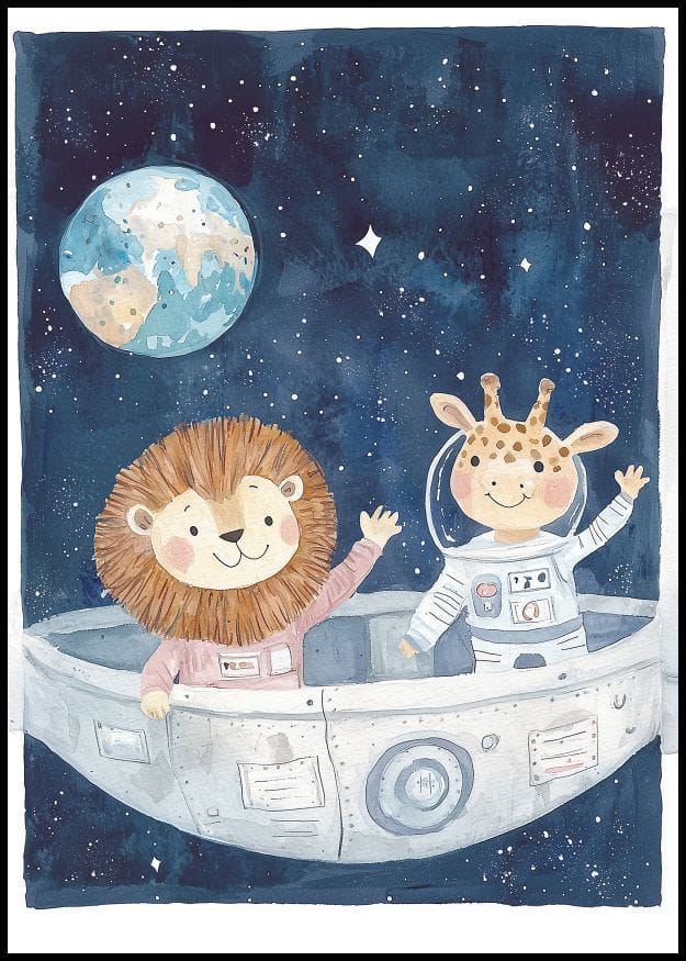 Ilustracja przedstawia lwa i żyrafę ubranych w skafandry kosmiczne, lecących statkiem kosmicznym w przestrzeni pełnej gwiazd. Tło jest ciemnoniebieskie, przedstawiające nocne niebo z Ziemią w oddali. Grafika ma przyjazne, pastelowe kolory, idealna do dekoracji pokoju dziecięcego.