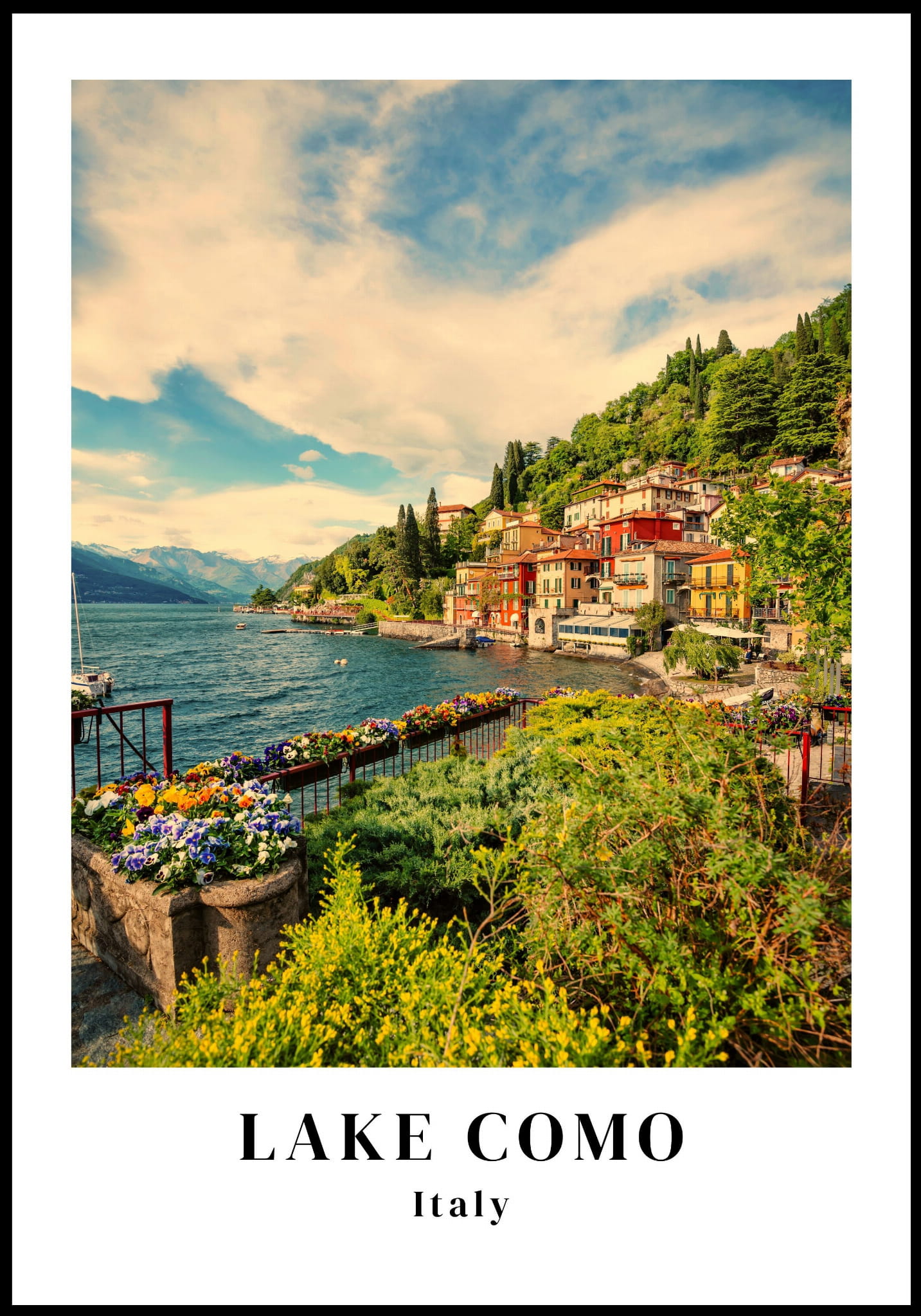 Plakat ukazuje malowniczy widok na Jezioro Como, otoczone kolorowymi budynkami i bujną roślinnością. Ciepłe barwy i spokojna woda tworzą sielankową atmosferę włoskiego krajobrazu.