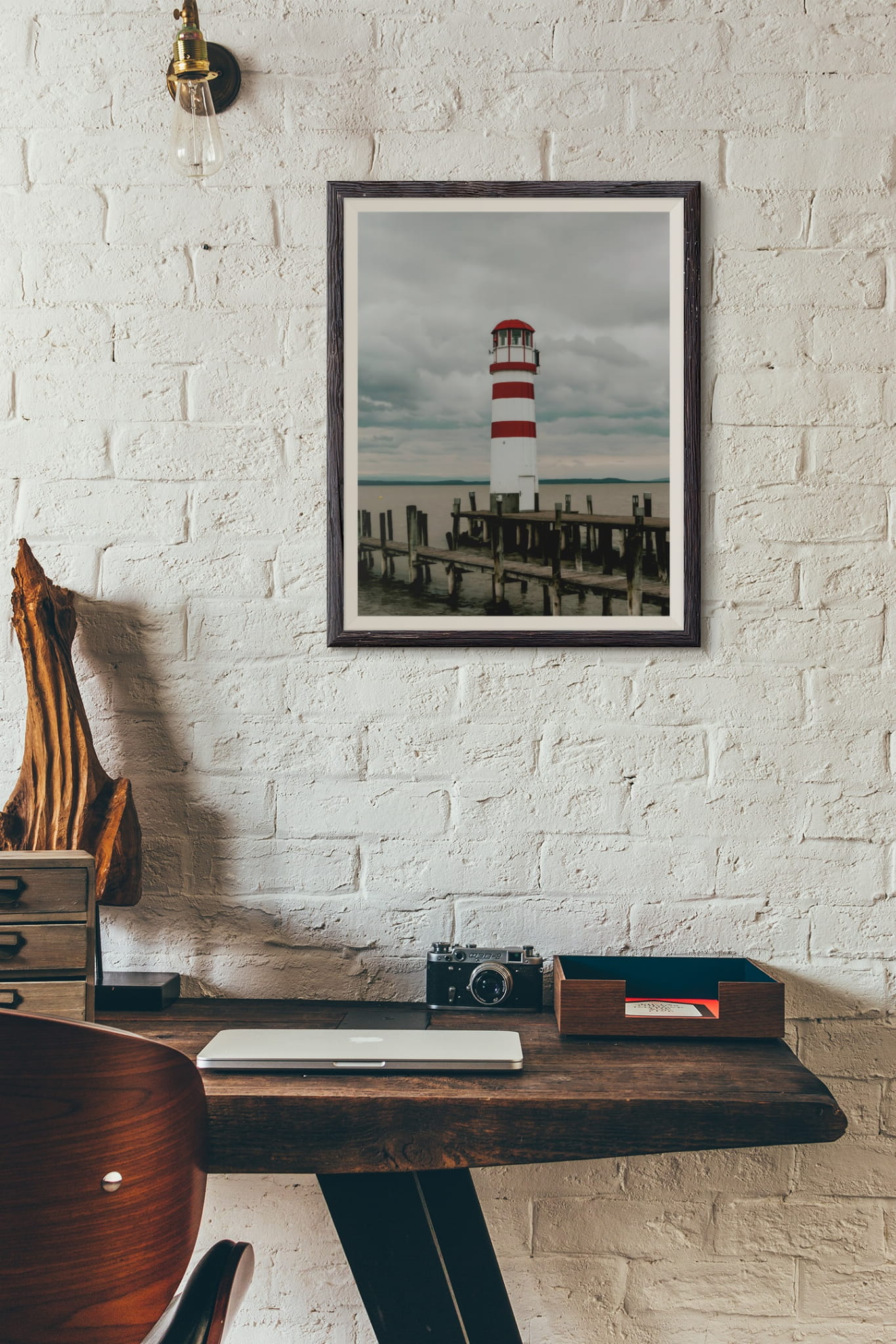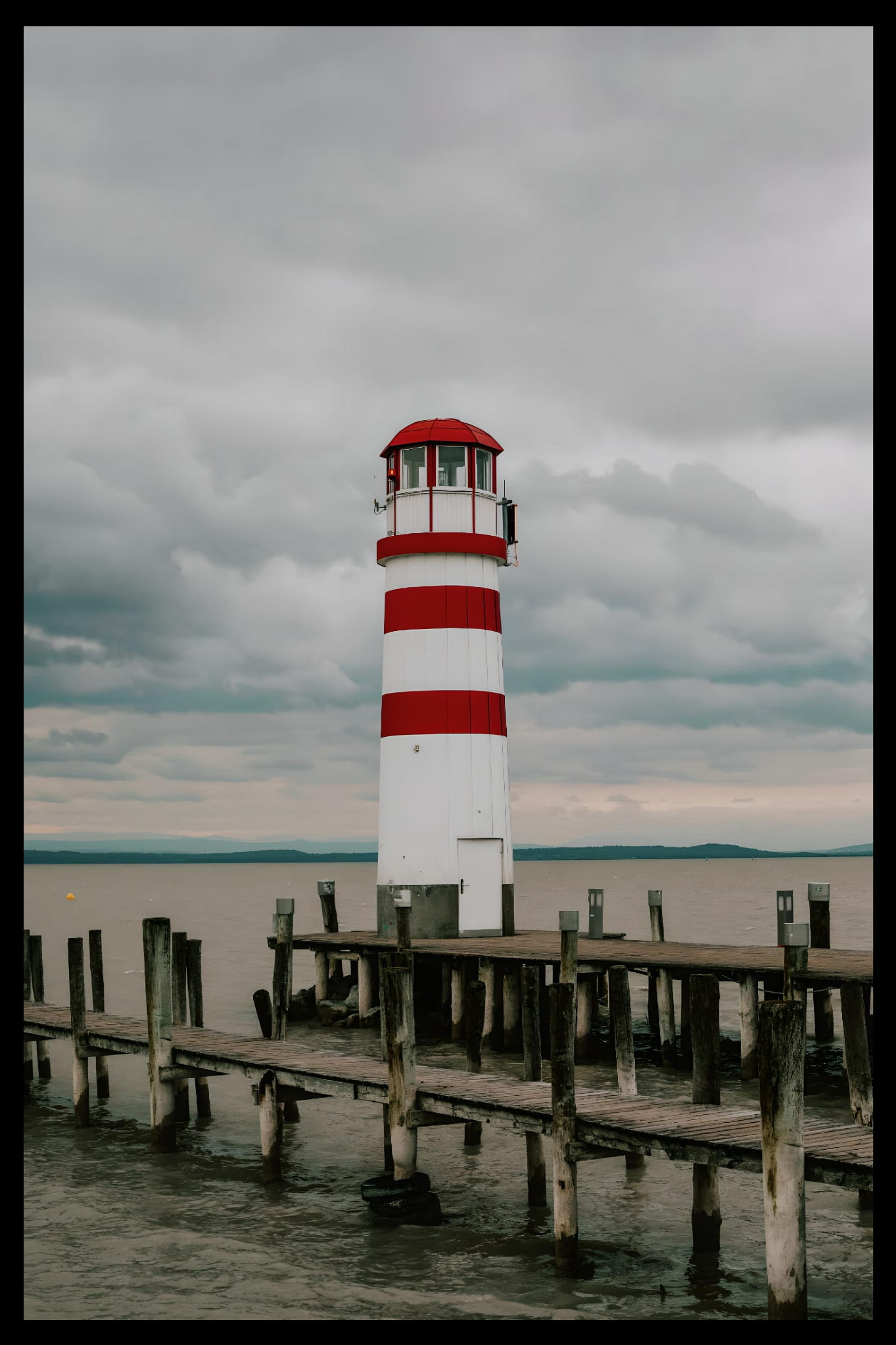 Plakat "Latarnia Morska" to urokliwa scena przedstawiająca latarnię morską, drewniany dok oraz spokojne morze. Kompozycja ta oddaje atmosferę ciszy i spokoju nadmorskiego krajobrazu. Wysokiej jakości wydruk doda charakteru każdemu pomieszczeniu, wprowadzając elementy natury i architektury.