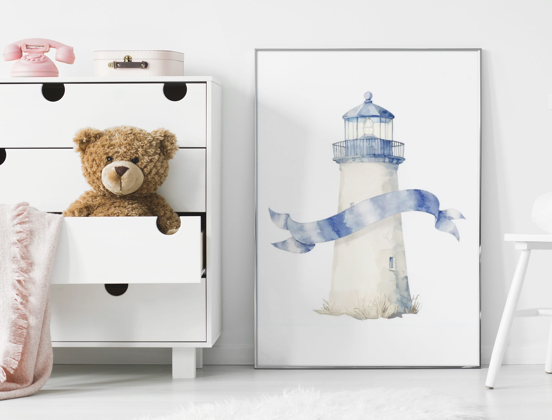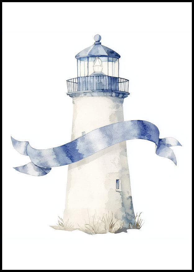 Ilustracja przedstawia latarnię morską z akcentami delikatnych, błękitnych odcieni.