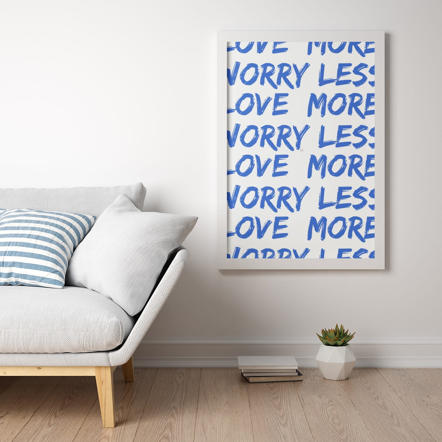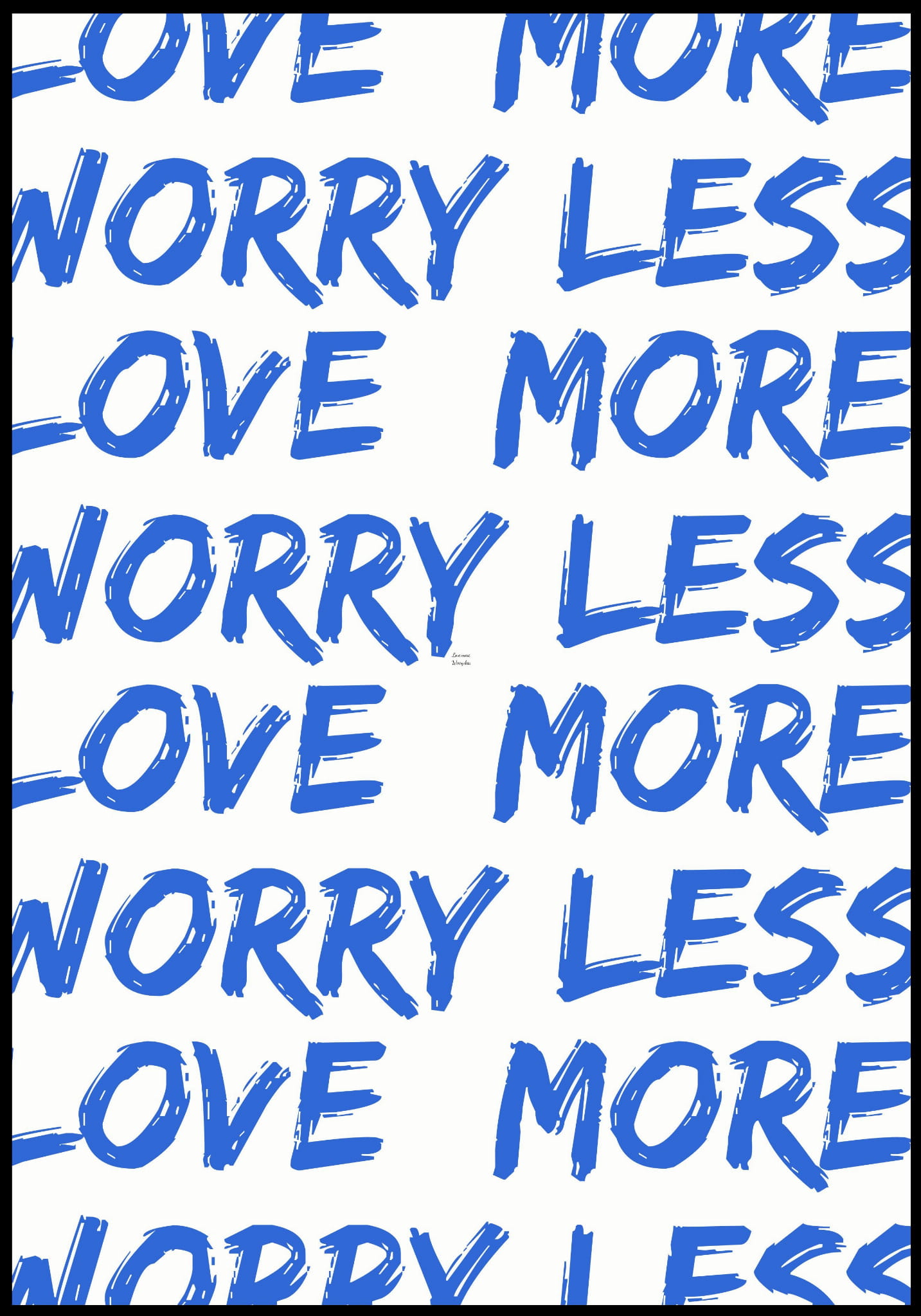 Plakat z napisem "Love More Worry Less" wypełniony jest powtarzającymi się frazami, które tworzą charakterystyczny wzór. Niebieski kolor liter na jasnym tle nadaje całości nowoczesny i dynamiczny wygląd. Powtarzające się słowa wprowadzają rytm i harmonię, podkreślając pozytywne przesłanie.
