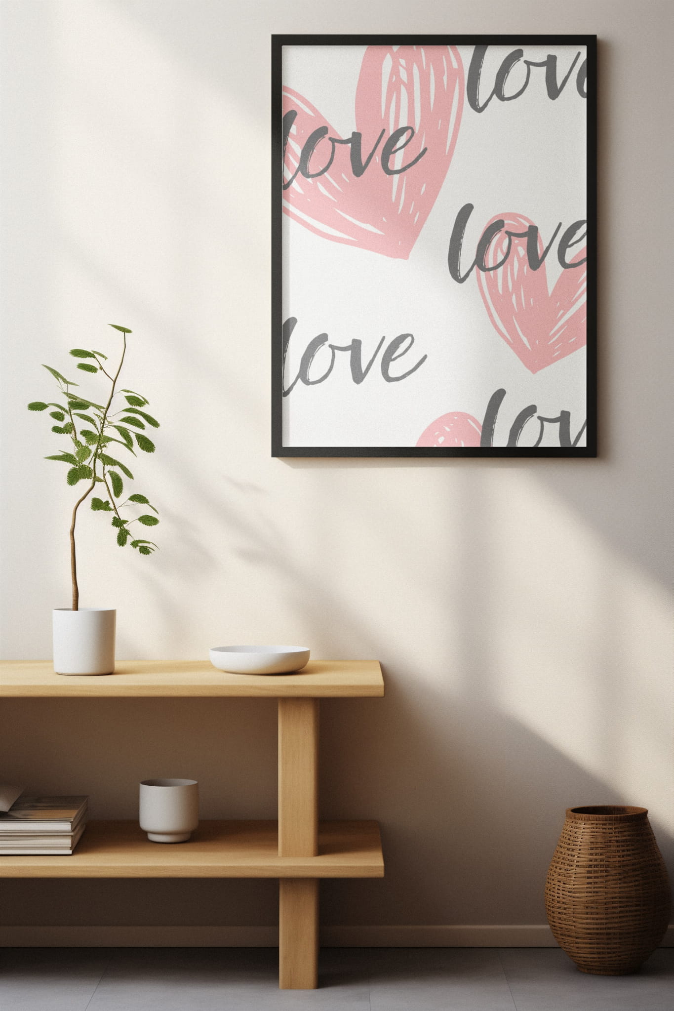 Plakat w stylu minimalistycznym, na którym dominują pastelowe odcienie różu i szarości. Na jasnym tle widoczne są duże, ręcznie rysowane serca oraz napis "love" powtarzający się w różnych miejscach. Kompozycja jest lekka i romantyczna, idealna do sypialni lub salonu, nadając pomieszczeniu przytulny i ciepły charakter. Prosty, ale elegancki design sprawia, że plakat ten pasuje zarówno do nowoczesnych, jak i klasycznych wnętrz. To doskonały wybór dla osób ceniących sobie subtelną estetykę i wyrażanie uczuć.
