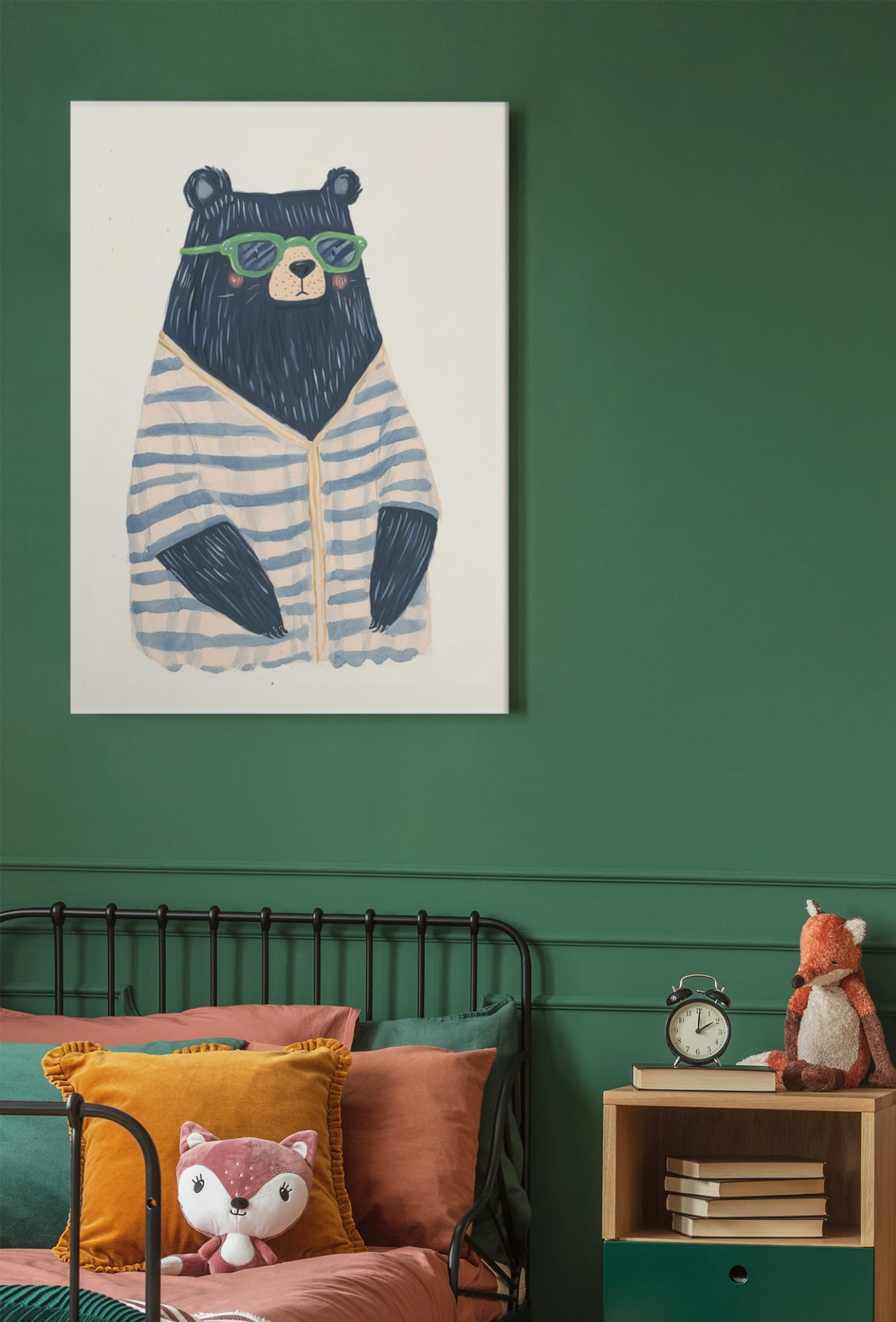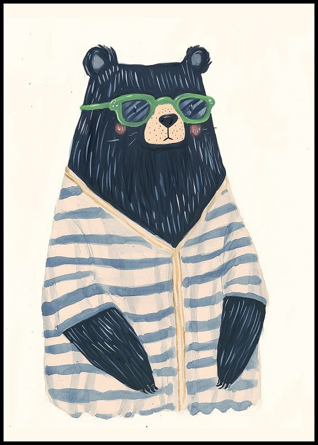 Ilustracja przedstawia czarnego niedźwiedzia ubranego w biały sweter w niebieskie paski. Miś ma na nosie zielone okulary przeciwsłoneczne, a tło jest jasne i subtelne.