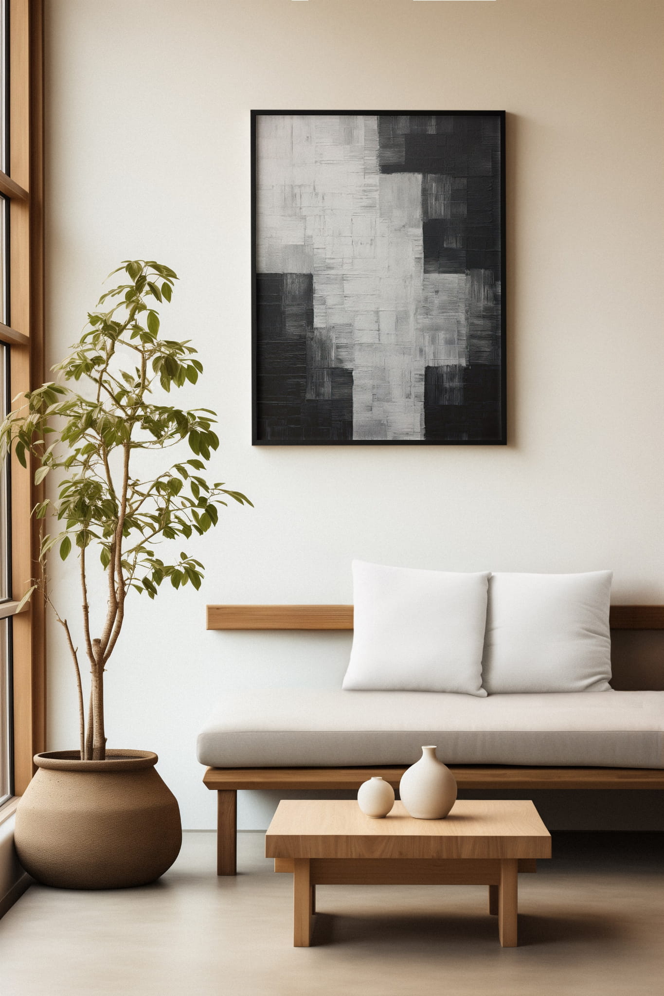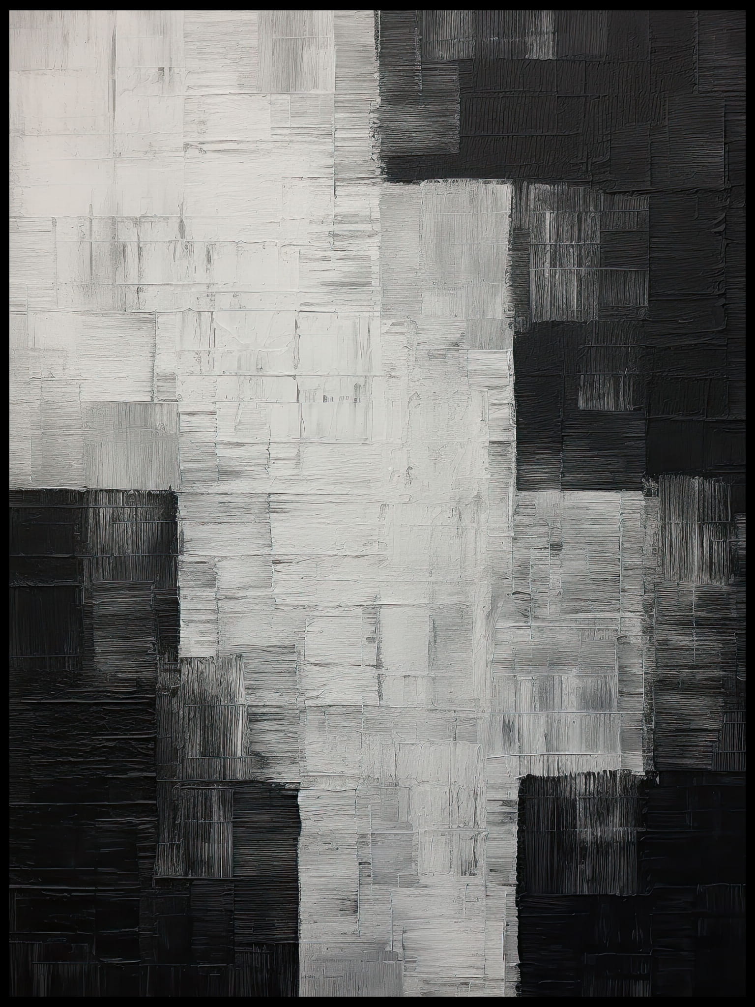 Plakat przedstawia kompozycję idealną do nowoczesnych wnętrz, stawiających na minimalizm. Czarno-białe barwy wprowadzają atmosferę spokoju i wyciszenia. Geometryczne formy dodają elegancji i prostoty. To propozycja dla miłośników sztuki abstrakcyjnej. Plakat dobrze sprawdzi się zarówno w biurze, jak i salonie.
