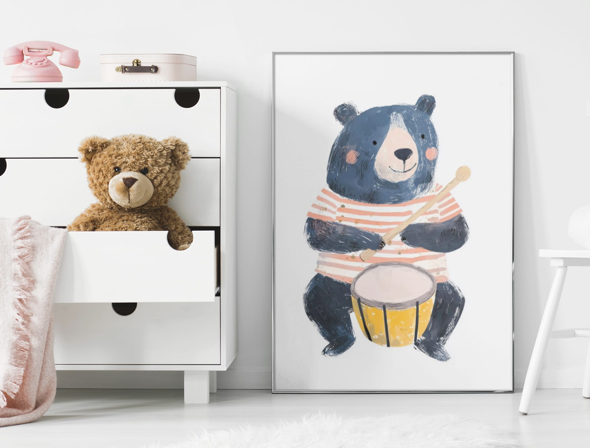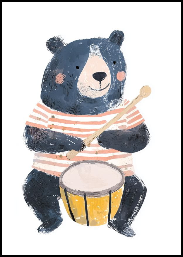 Ilustracja uroczo przedstawia niedźwiedzia w pasiastym ubraniu, grającego na bębnie. Miękkie, pastelowe kolory nadają obrazowi przytulny, dziecięcy charakter.