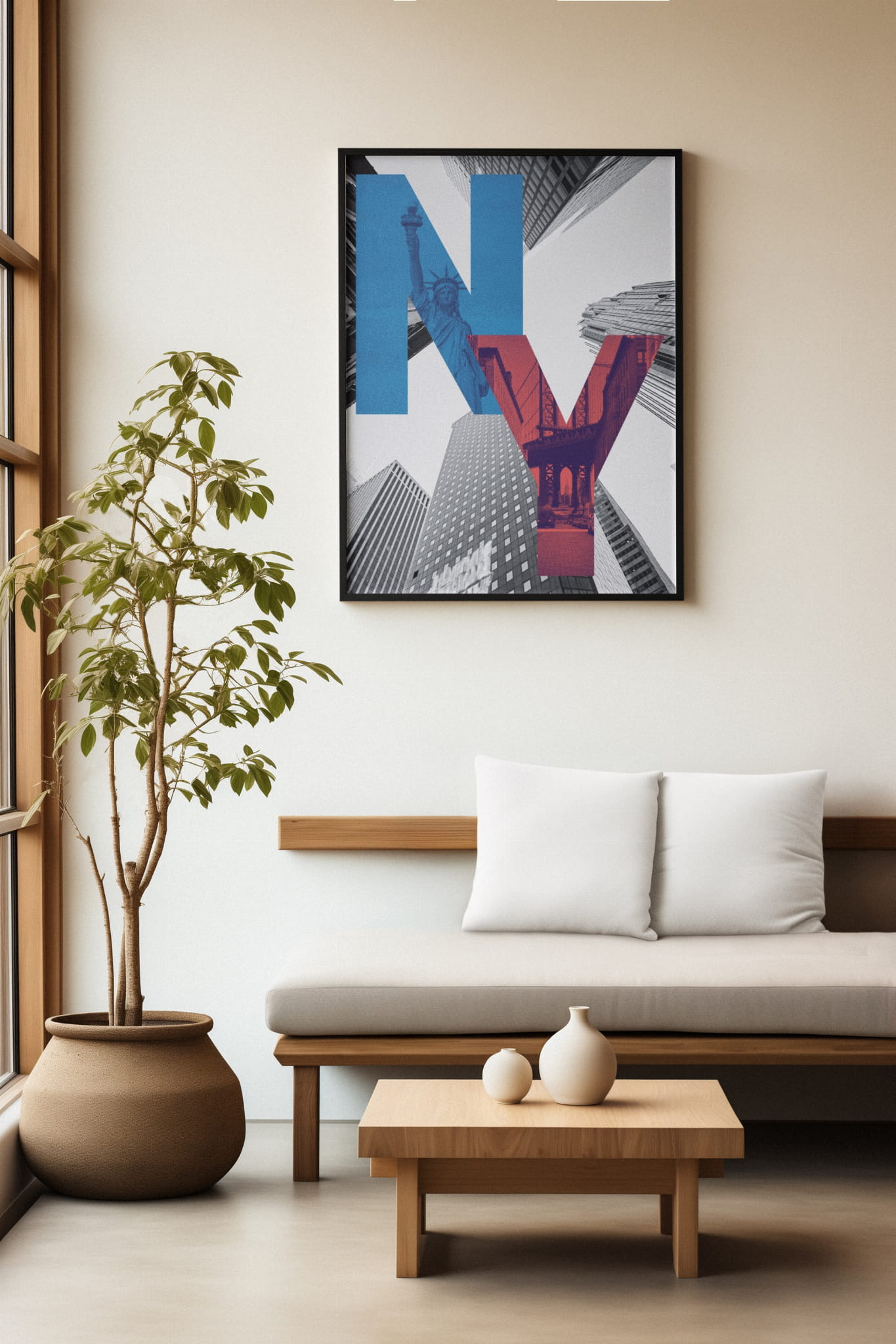 Ilustracja przedstawia litery "N" i "Y" symbolizujące Nowy Jork, z wysokimi budynkami w tle. Plakat wykorzystuje kontrast między kolorowymi elementami a monochromatycznym tłem. Całość oddaje klimat wielkomiejski Nowego Jorku.