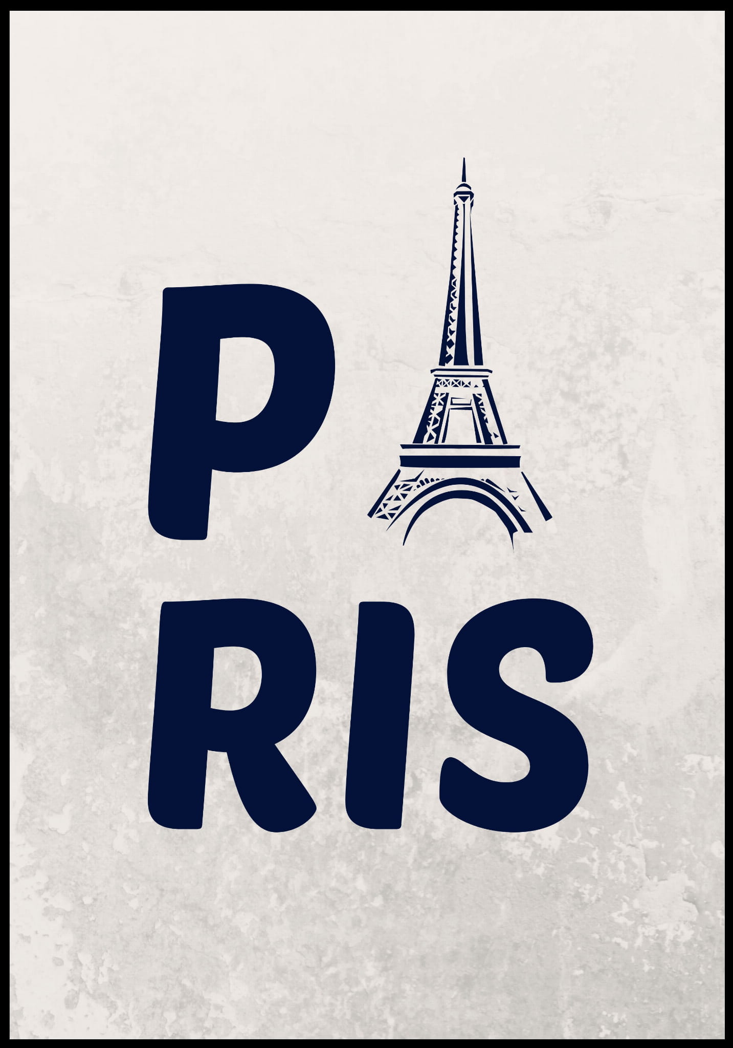 Plakat przedstawia stylizowany napis "Paris", gdzie litera "A" została zastąpiona wizerunkiem Wieży Eiffla. Prosty, nowoczesny design oddaje charakter Paryża, łącząc elegancję z symboliką miasta miłości. Monochromatyczne kolory nadają plakatowi klasyczny wygląd.