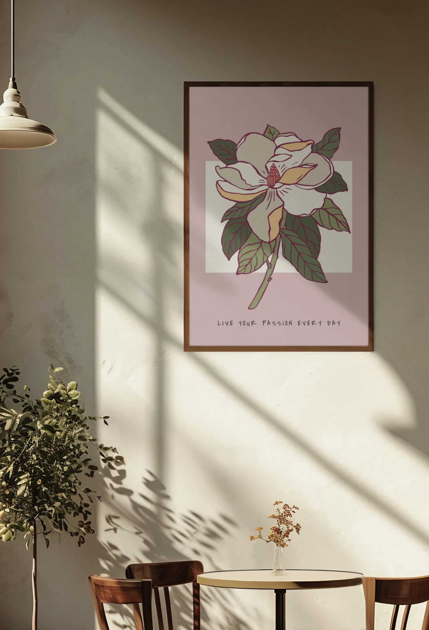 Plakat przedstawia pojedynczy, wyrazisty kwiat w otoczeniu liści, z motywującym napisem na dole.