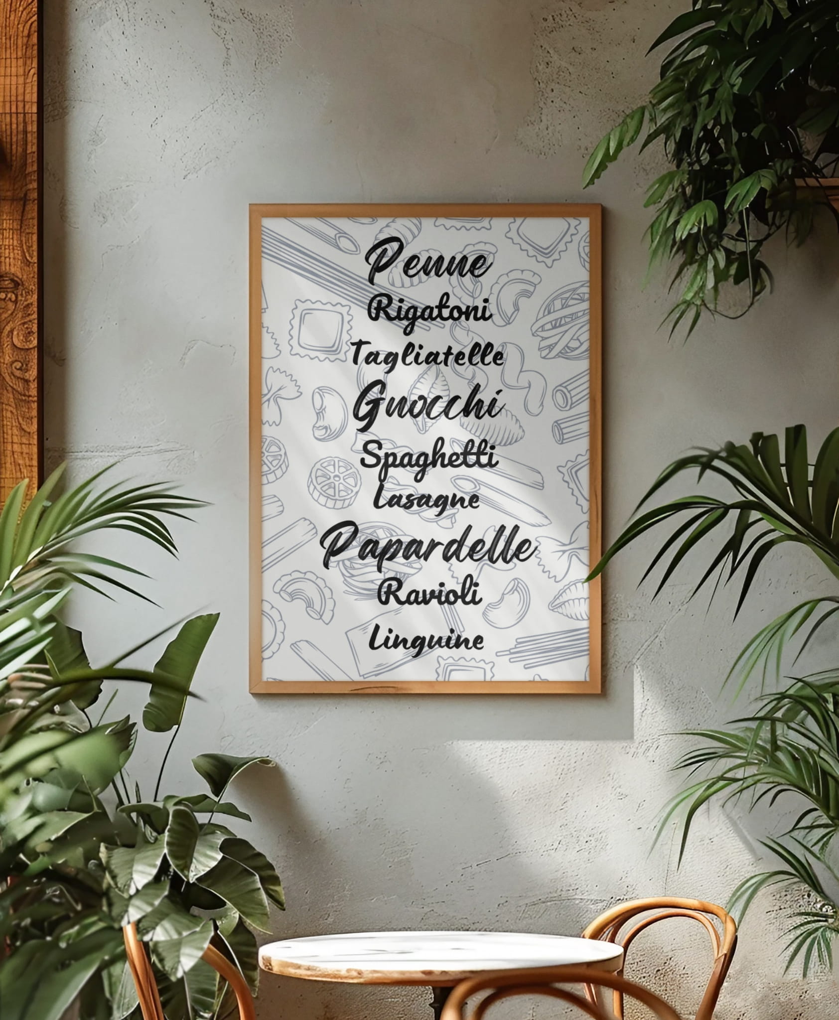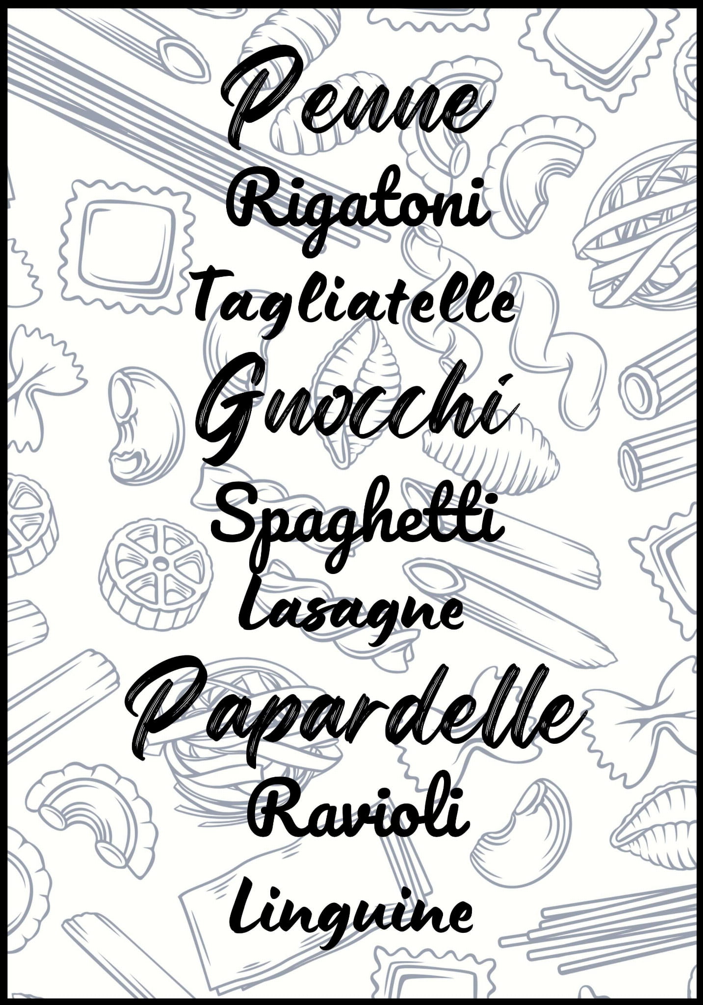 Ilustracja przedstawia różne rodzaje makaronów na tle pastelowych odcieni. W centralnej części znajdują się nazwy makaronów napisane w czarnym, stylizowanym krojem pisma.
