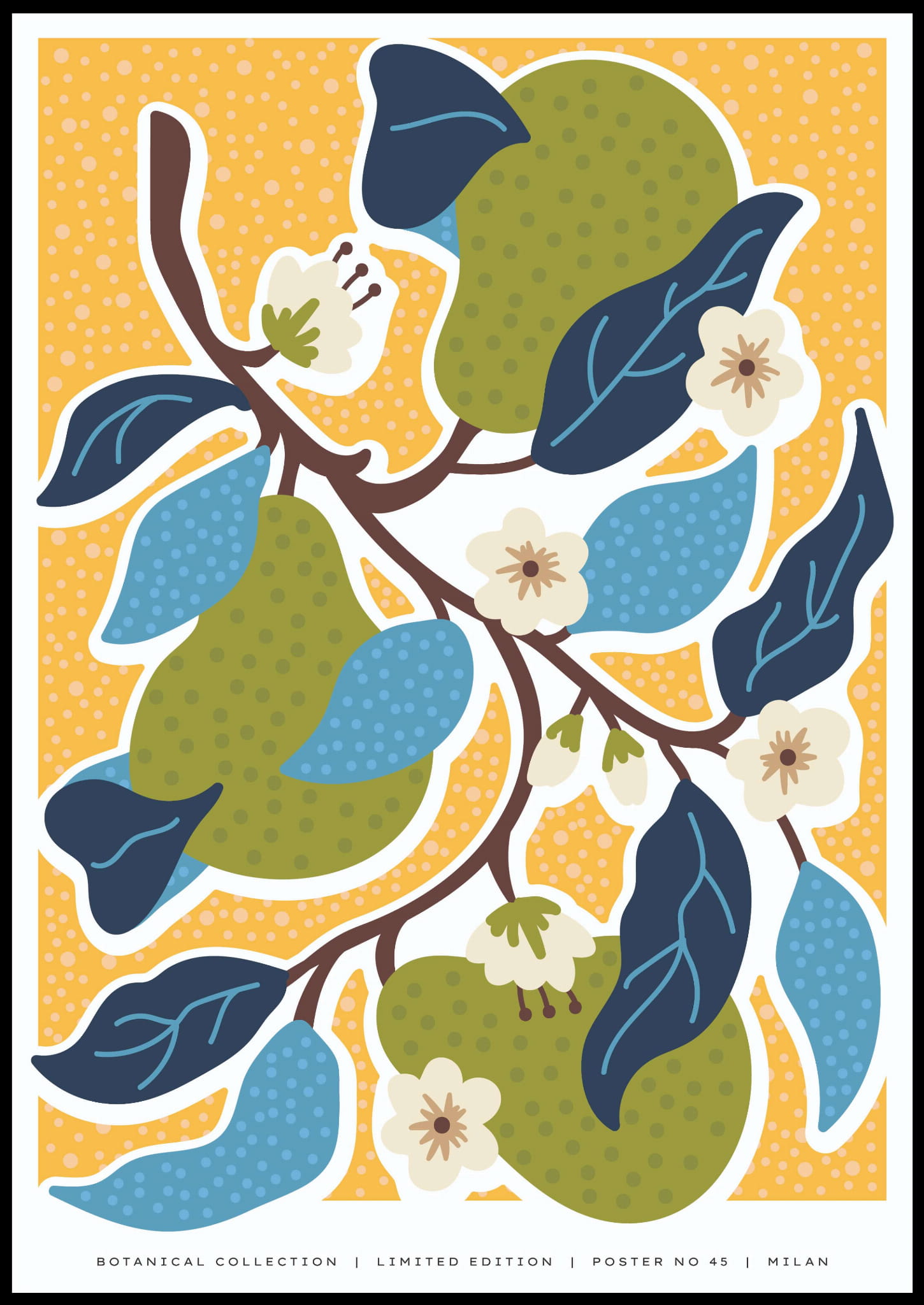 Ilustracja przedstawia zielone gruszki na gałęzi z niebieskimi liśćmi i kwiatami na pomarańczowym tle.
