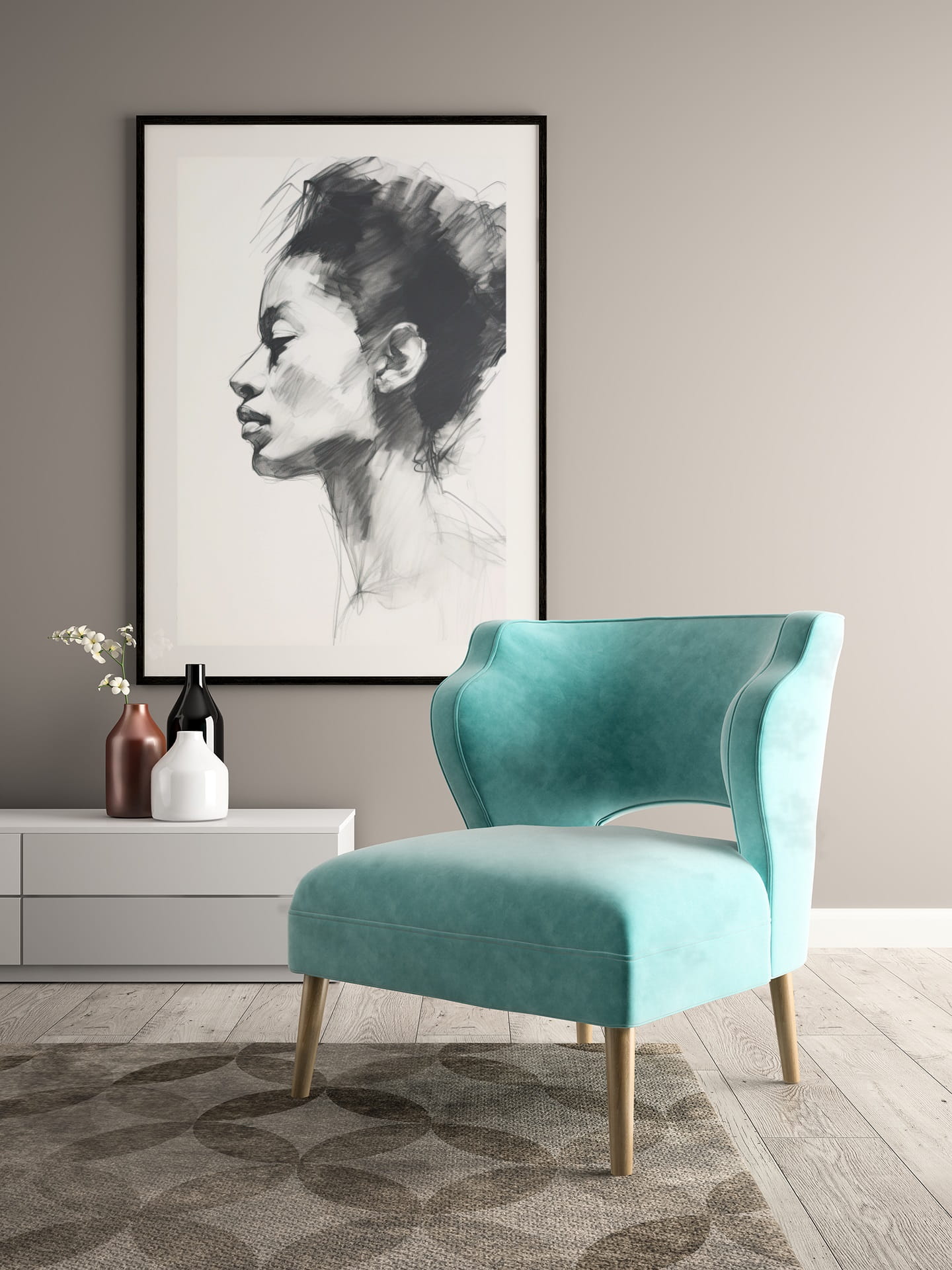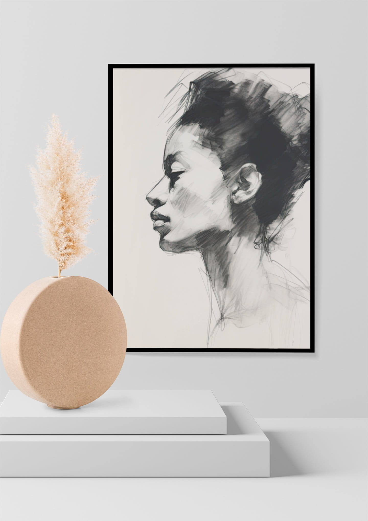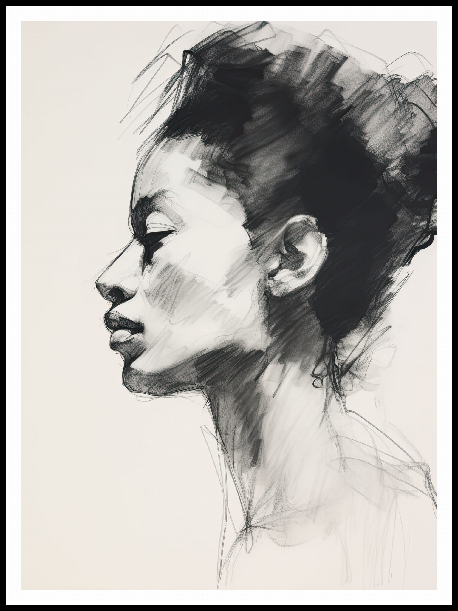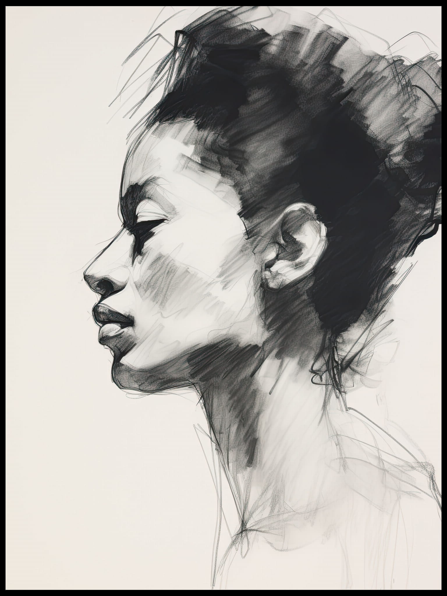 Piękny szkic przedstawiający profil kobiety. Delikatne linie i cienie oddają wyrazisty wyraz twarzy. Minimalistyczny styl podkreśla elegancję i prostotę rysunku. Idealny plakat do nowoczesnych i klasycznych wnętrz.