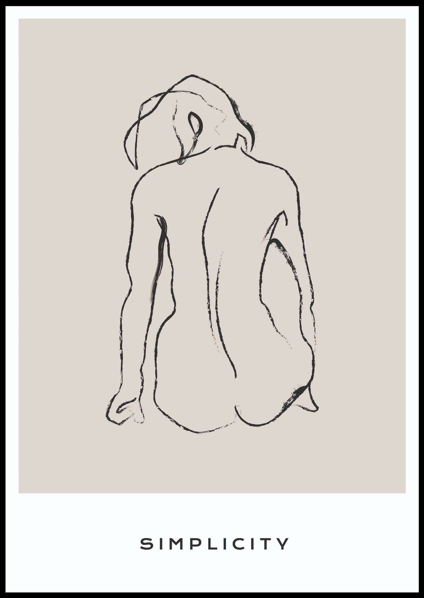 Ilustracja przedstawia kobiecą sylwetkę widzianą od tyłu, wykonaną delikatnymi czarnymi liniami na jasnym, neutralnym tle.