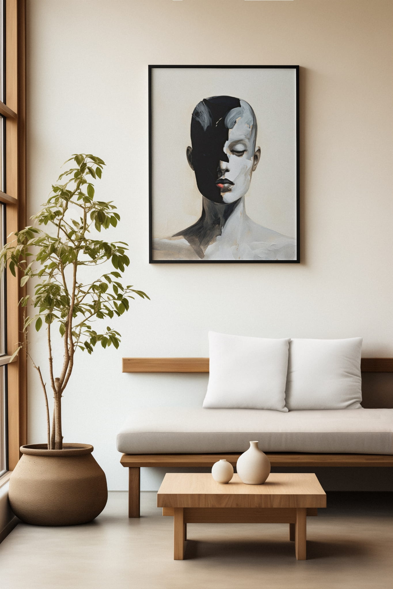 Plakat przedstawia twarz o abstrakcyjnym, podzielonym wyglądzie, gdzie jedna strona jest ciemna, a druga jasna. Kontrast między czernią a bielą tworzy silne wizualne napięcie. Zamknięte oczy dodają pracy wyrazu spokoju i introspekcji. Subtelne odcienie szarości i czerwieni w ustach wzbogacają całość o delikatne akcenty.