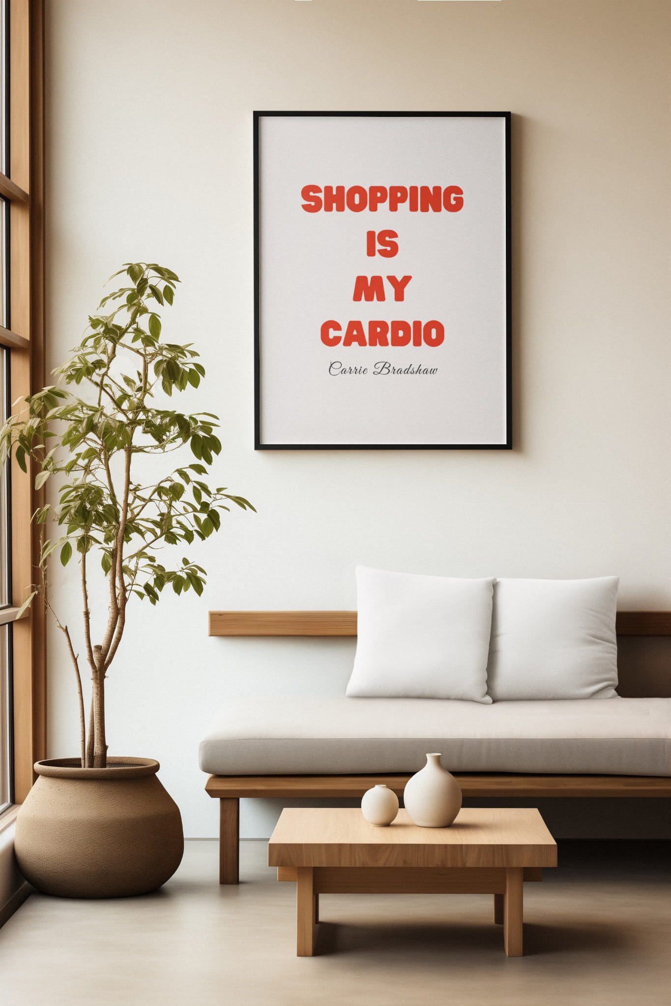 Plakat z cytatem "Shopping is my cardio" Carrie Bradshaw.
