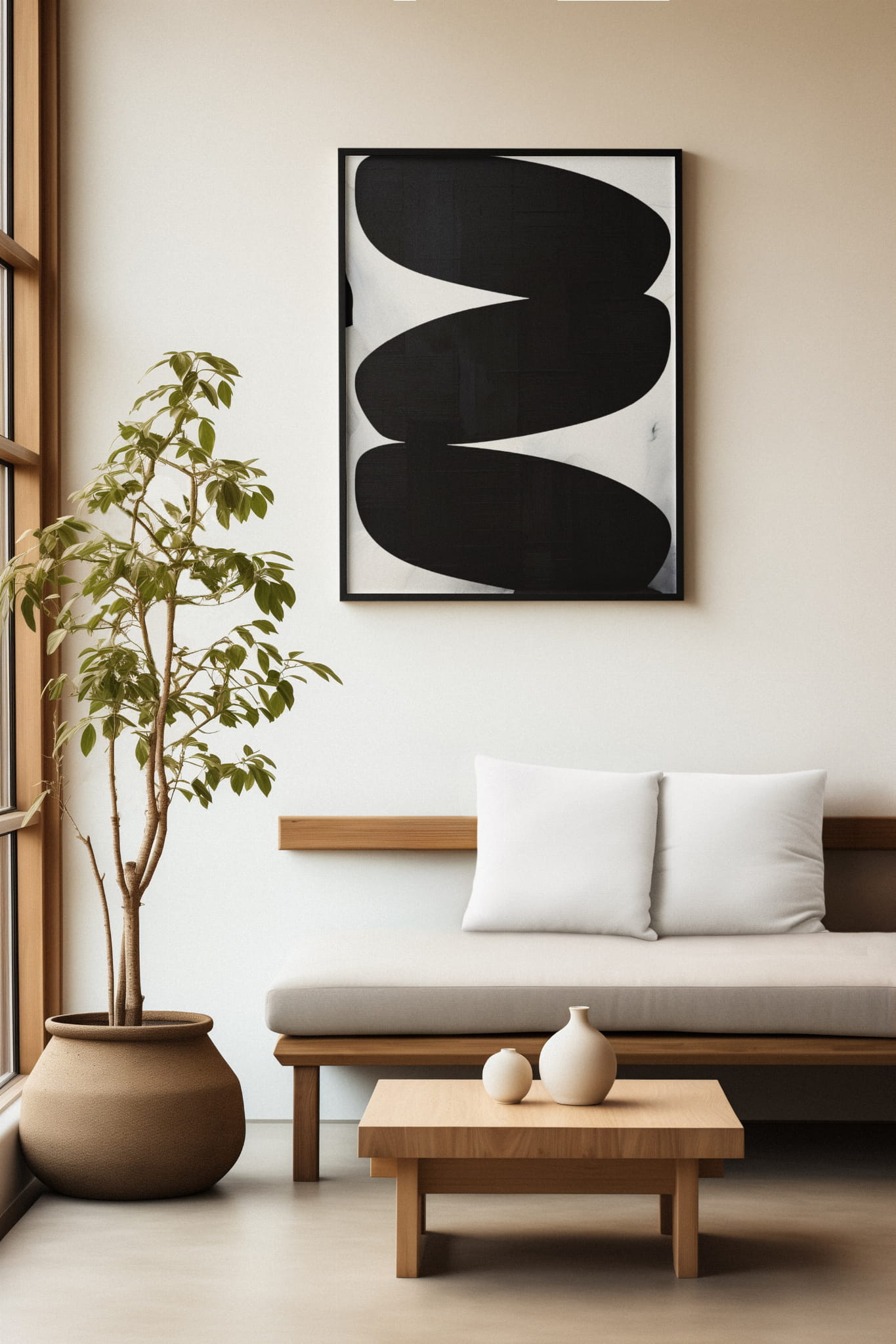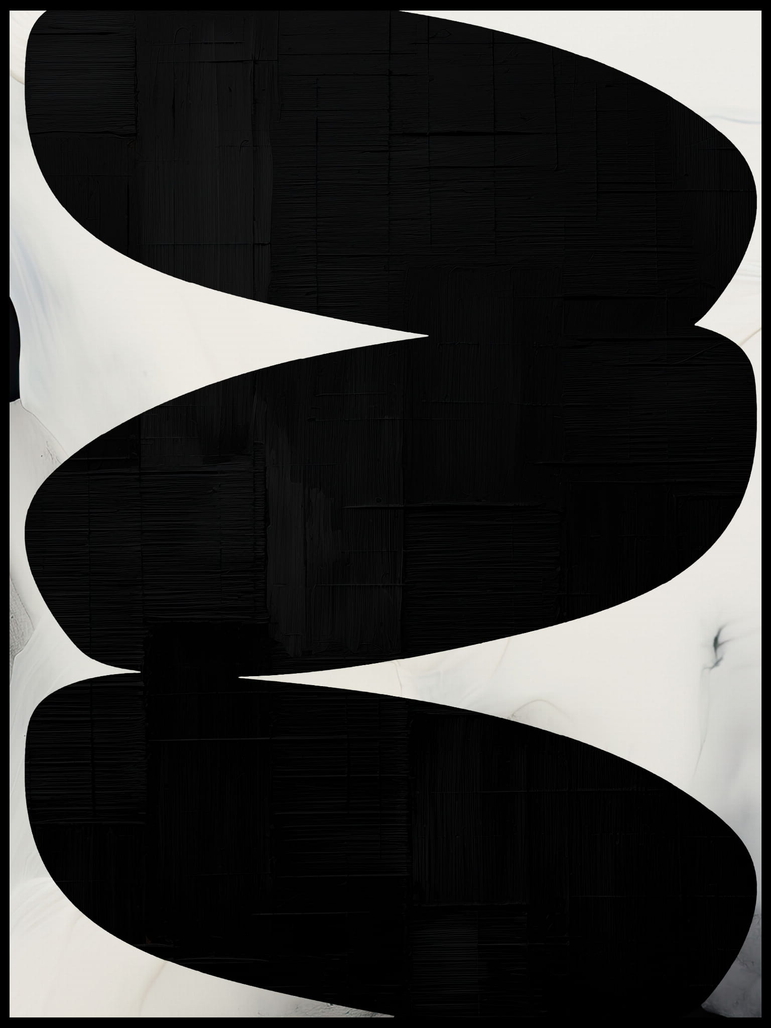 Plakat przedstawia minimalistyczną formę z dominującym kontrastem czerni i bieli. Obłe kształty przypominają płynne linie, tworząc nowoczesny, abstrakcyjny wzór. Prosta kolorystyka nadaje pracy elegancji i wyrafinowania.