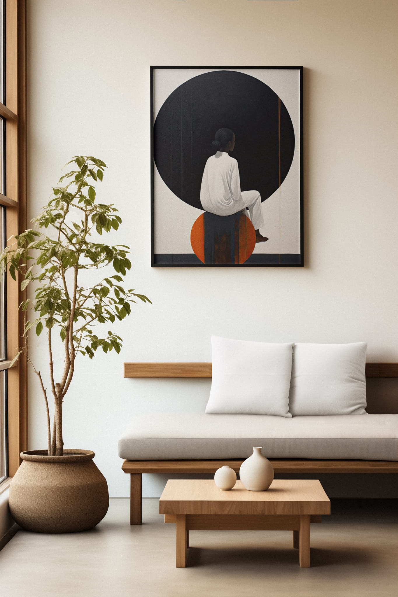Plakat przedstawia postać siedzącą w białym stroju, zwróconą tyłem, w minimalistycznej scenerii. Dominującym elementem jest czarne tło w formie okręgu, który tworzy kontrast z jasnymi kolorami ubrania. Kompozycja podkreśla moment wyciszenia i skupienia, a stonowana paleta barw nadaje całości spokojny, medytacyjny charakter. Plakat może stanowić elegancki dodatek do nowoczesnych wnętrz, wprowadzając atmosferę refleksji i spokoju.