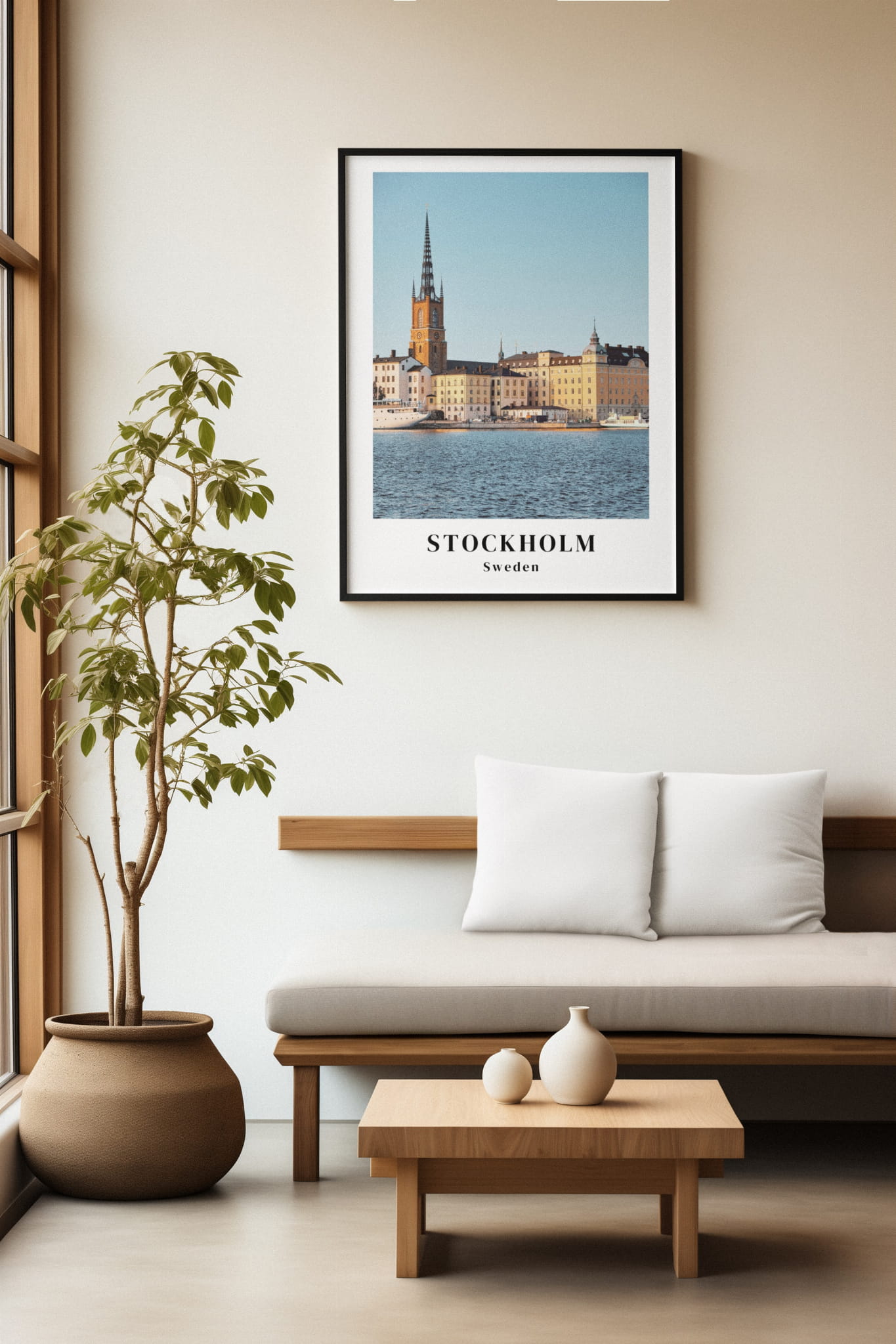 Plakat przedstawia urokliwy widok miasta Stockholm. Jego spokojny klimat idealnie oddaje atmosferę szwedzkiej stolicy. Zdjęcie prezentuje architekturę oraz wody otaczające miasto. Taki plakat będzie świetnym dodatkiem do wnętrza w stylu skandynawskim. Idealnie wpasuje się w nowoczesne i minimalistyczne przestrzenie.
