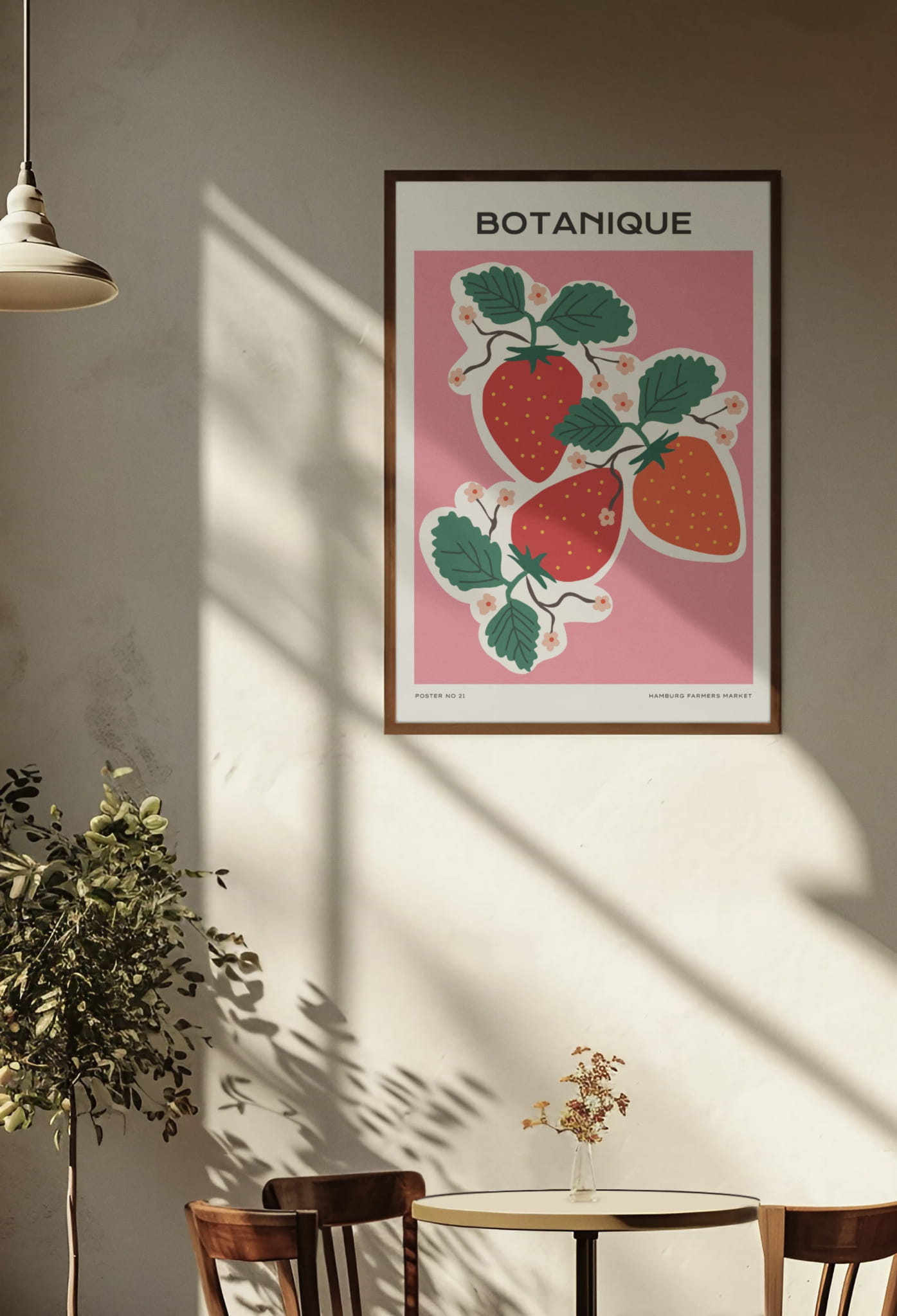 Ilustracja przedstawia truskawki z zielonymi liśćmi i małymi różowymi kwiatkami na jasnoróżowym tle.