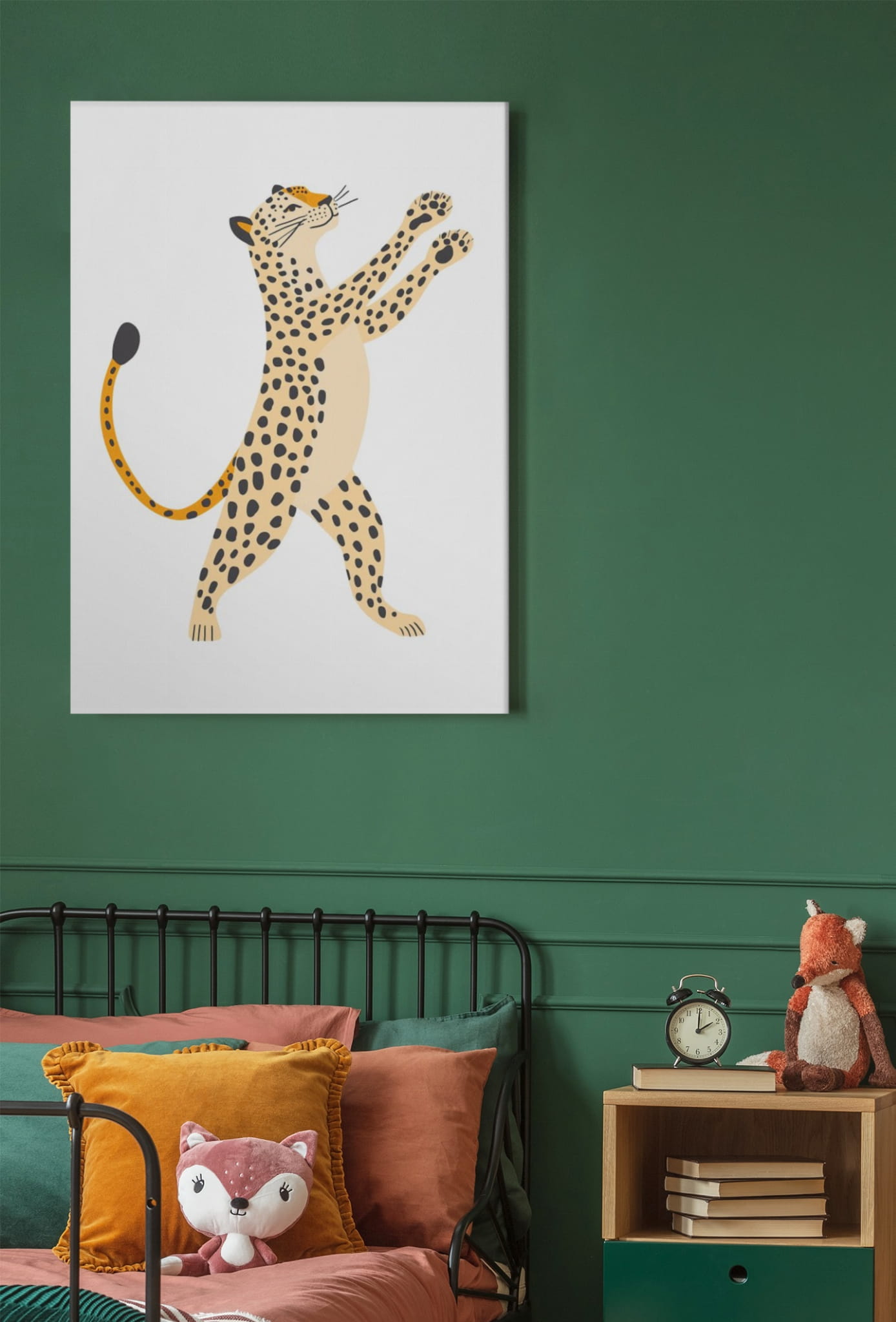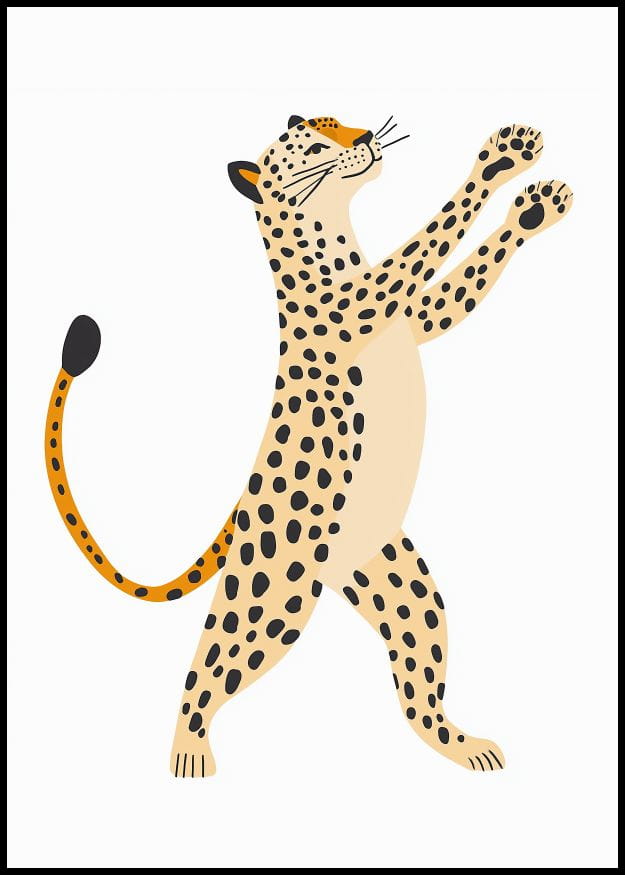 Plakat przedstawia tańczącego lamparta. Idealny jako nowoczesna dekoracja, która wprowadzi do wnętrza element dzikiej przyrody i egzotycznego klimatu.