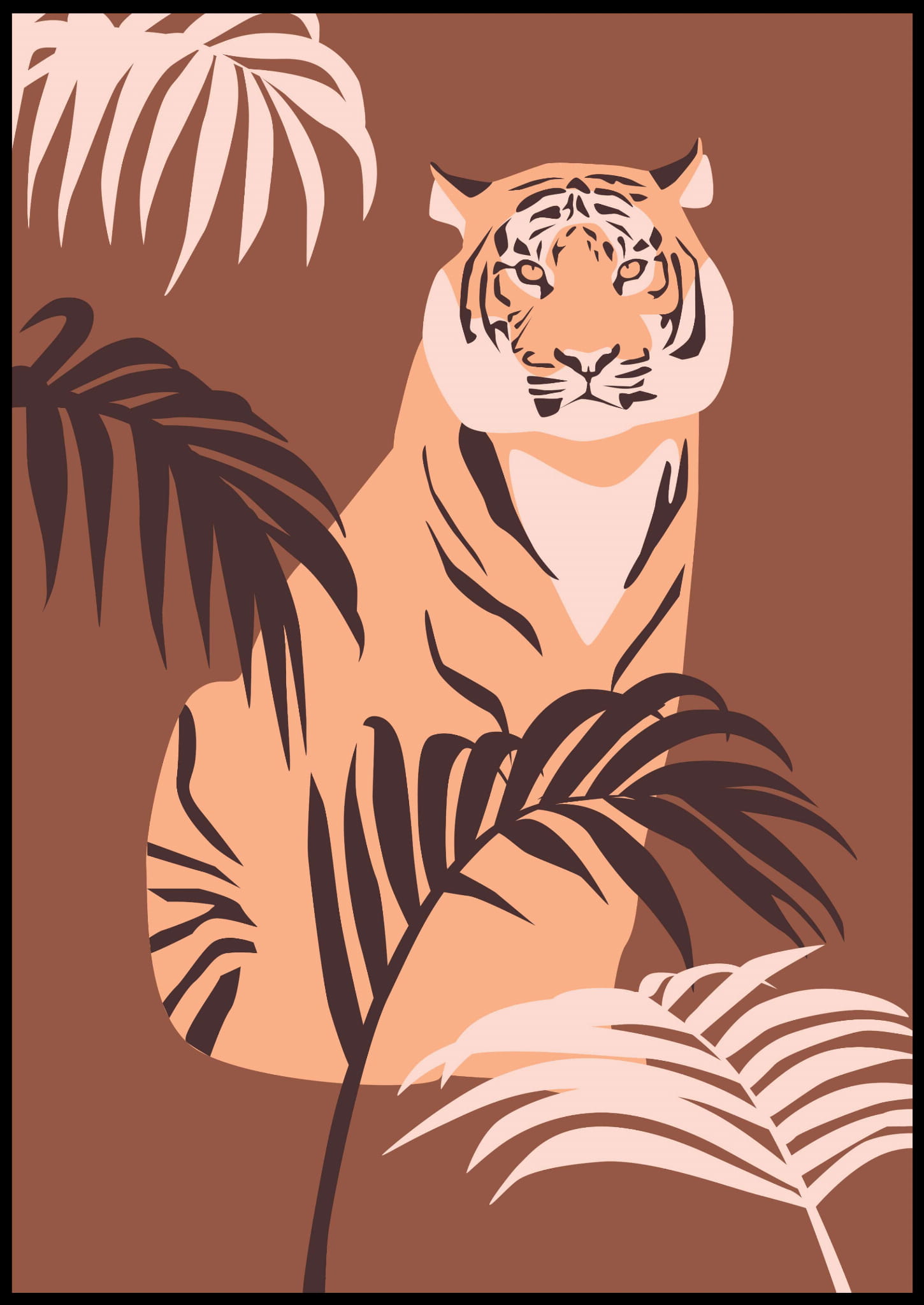Plakat przedstawia tygrysa siedzącego wśród tropikalnych liści, co tworzy atmosferę dżungli. Dominują ciepłe, ziemiste barwy, które podkreślają naturalność i dzikość scenerii.