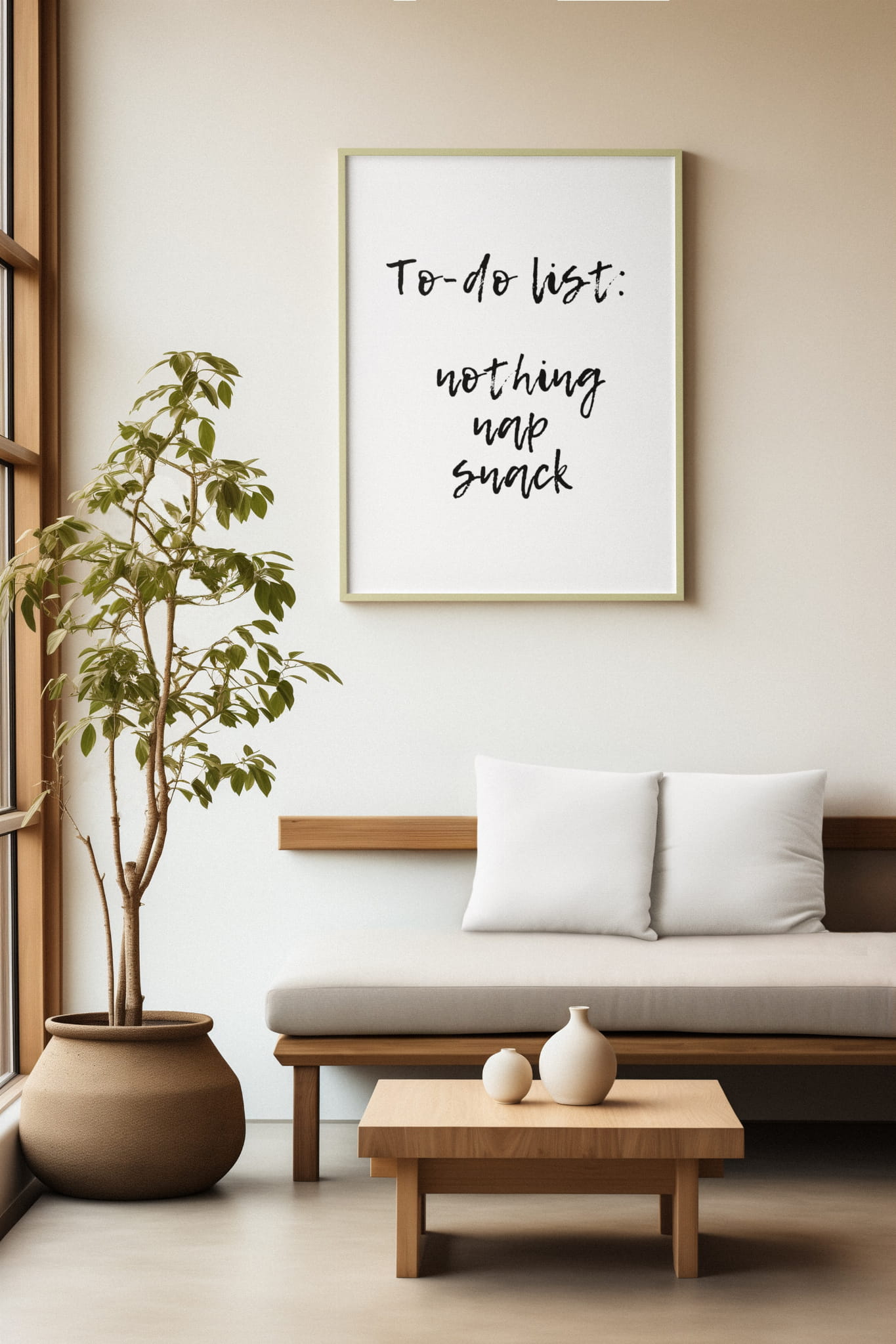 Plakat przedstawia żartobliwą listę zadań "To-do list: nothing, nap, snack" na białym tle. Tekst jest napisany czarną, nieco niedbałą czcionką, co dodaje mu lekkości i humoru. Minimalistyczny design sprawia, że przekaz jest prosty i bezpośredni.