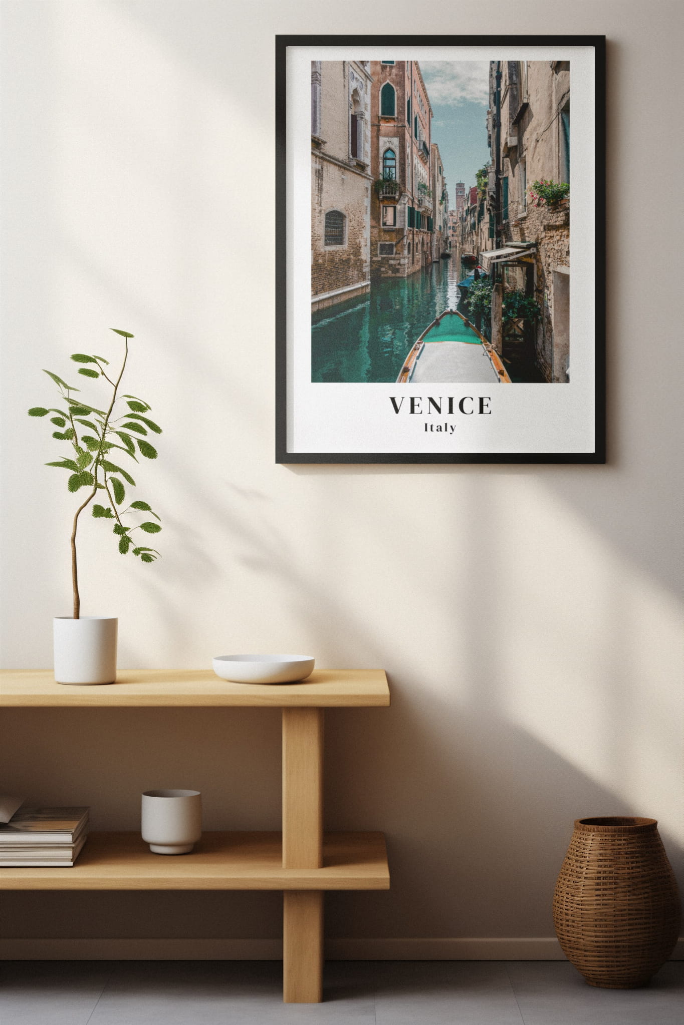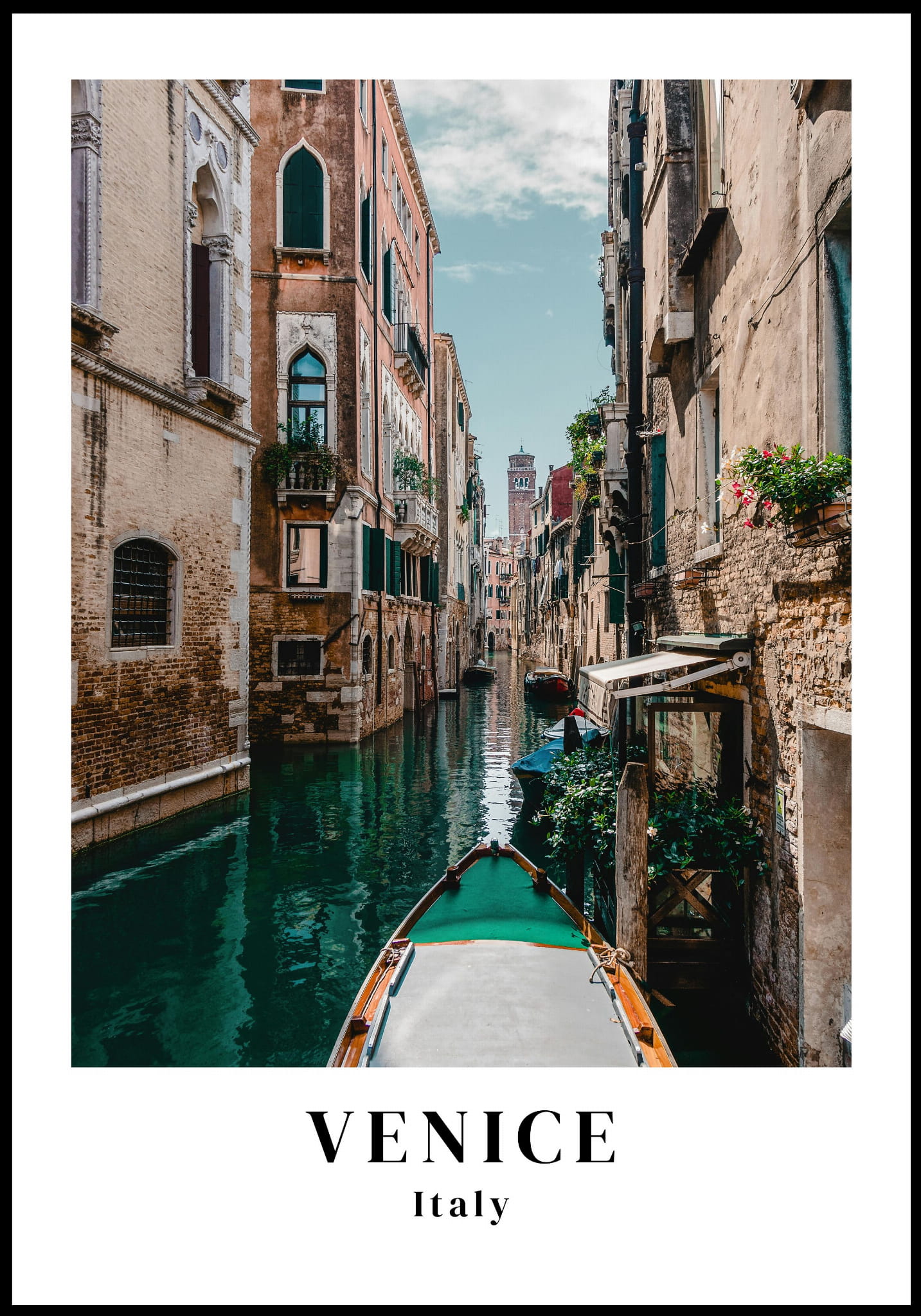 Ten plakat przedstawia urokliwy kanał w Wenecji, z malowniczymi kamienicami i tradycyjną łodzią na pierwszym planie. Jasne kolory i wąskie uliczki oddają wyjątkową atmosferę tego miasta na wodzie. Idealny dla miłośników włoskiej architektury i romantycznych krajobrazów. Wprowadź do swojego domu klimat weneckich kanałów!
